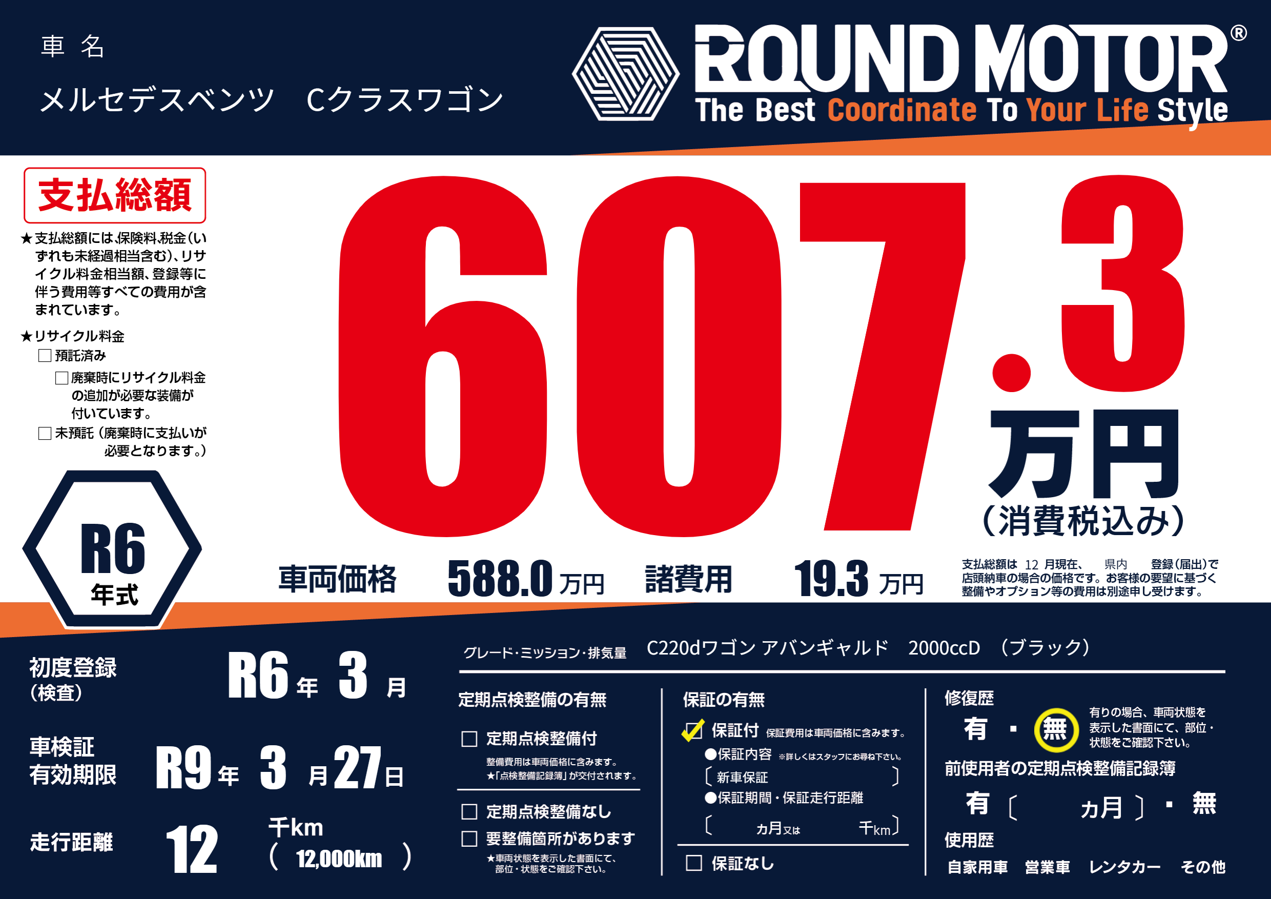 | 車名 | メルセデスベンツ Cクラスワゴン | グレード ミッション 排気量 |