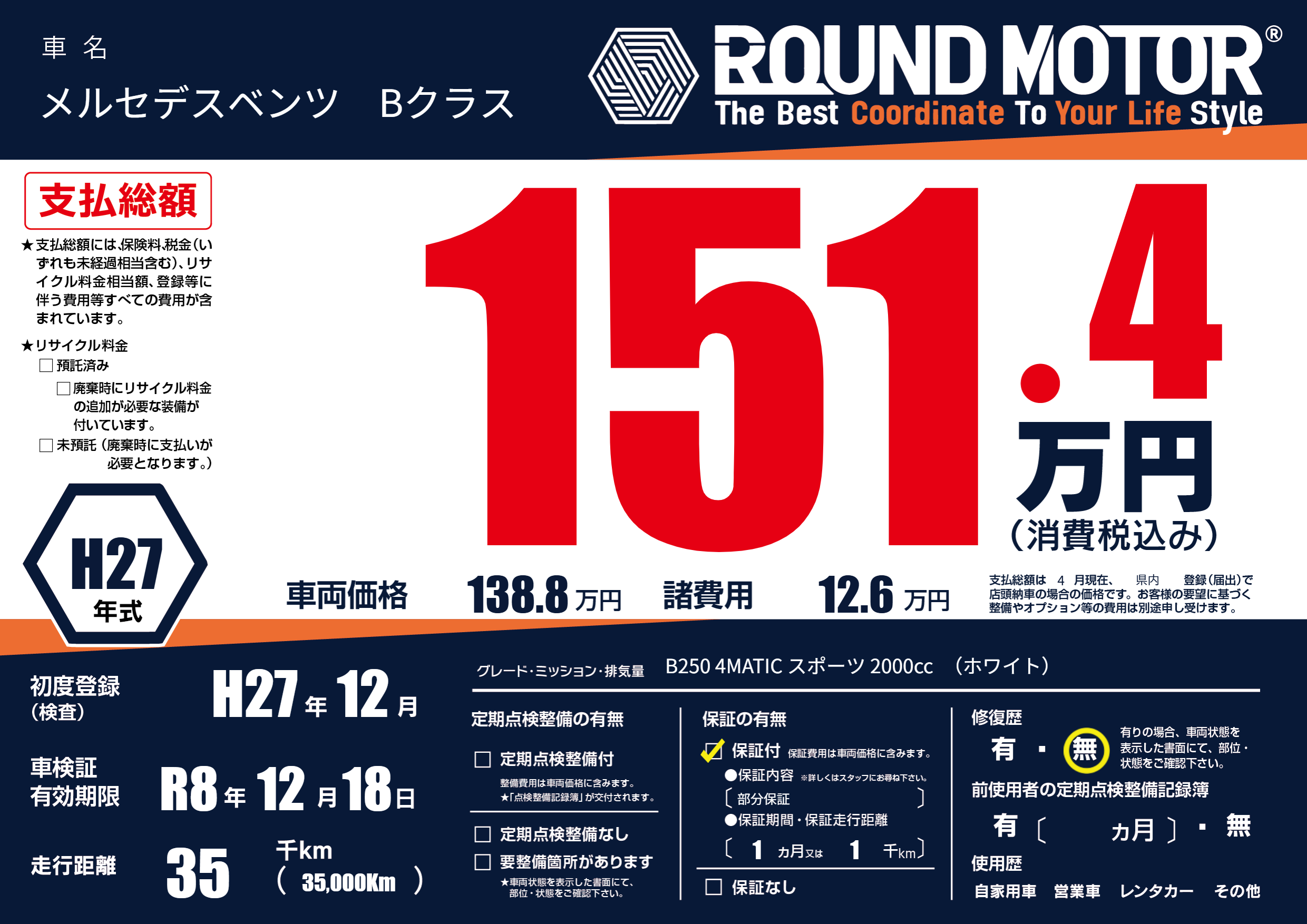 | 車名 | メルセデスベンツ Bクラス | グレード ミッション 排気量 |