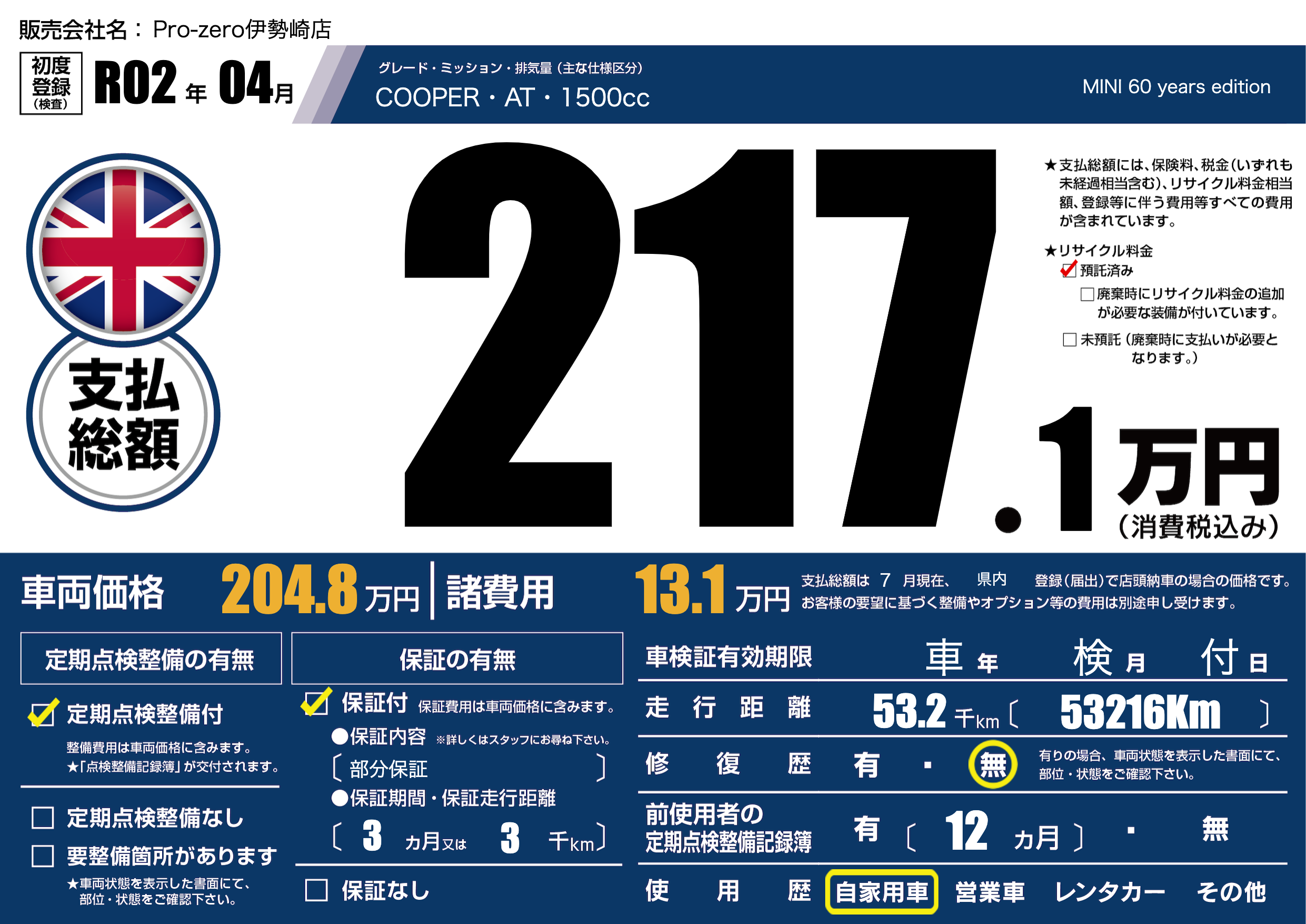 | 車名 | MINI 60 years edition | グレード ミッション 排気量 |