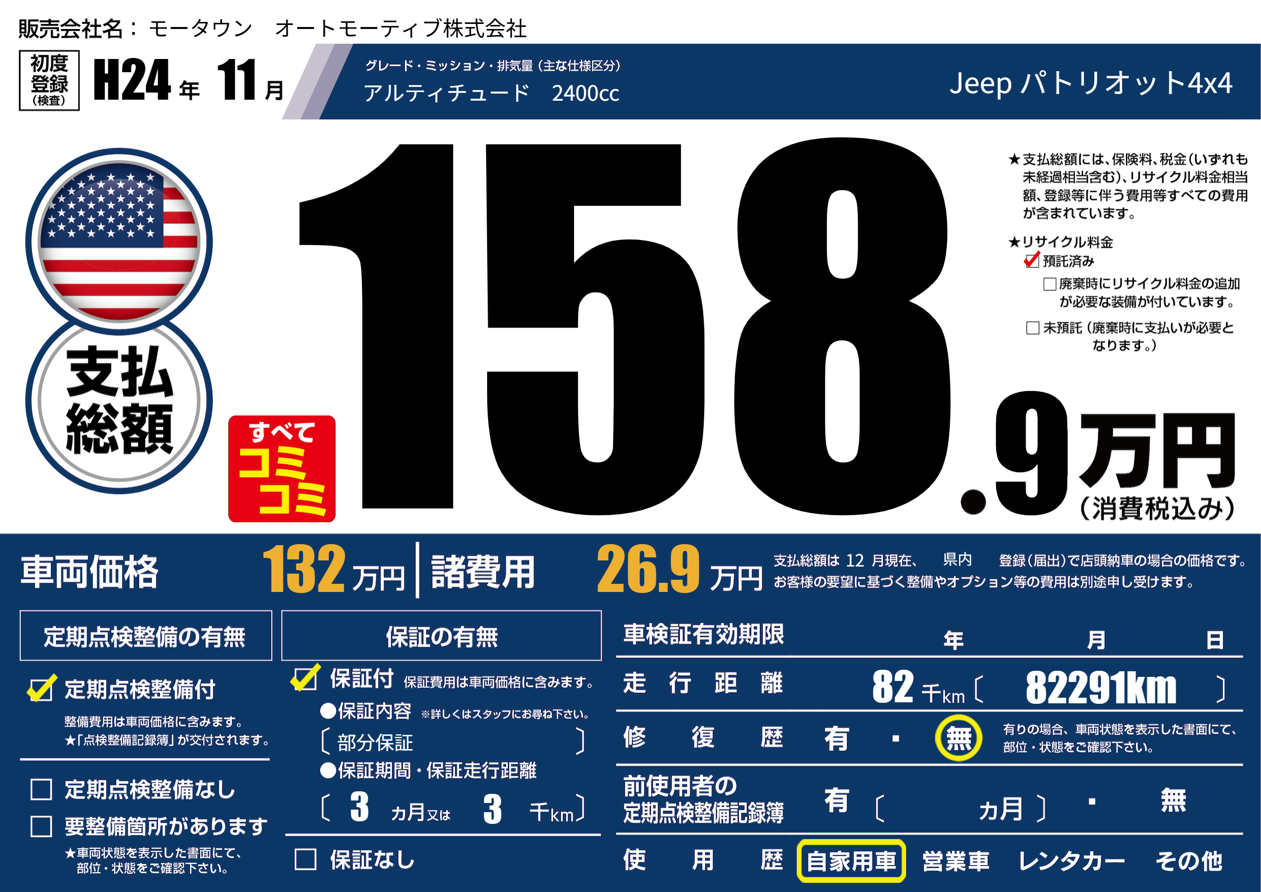 | 車名 | Jeep パトリオット4x4 | グレード ミッション 排気量 |