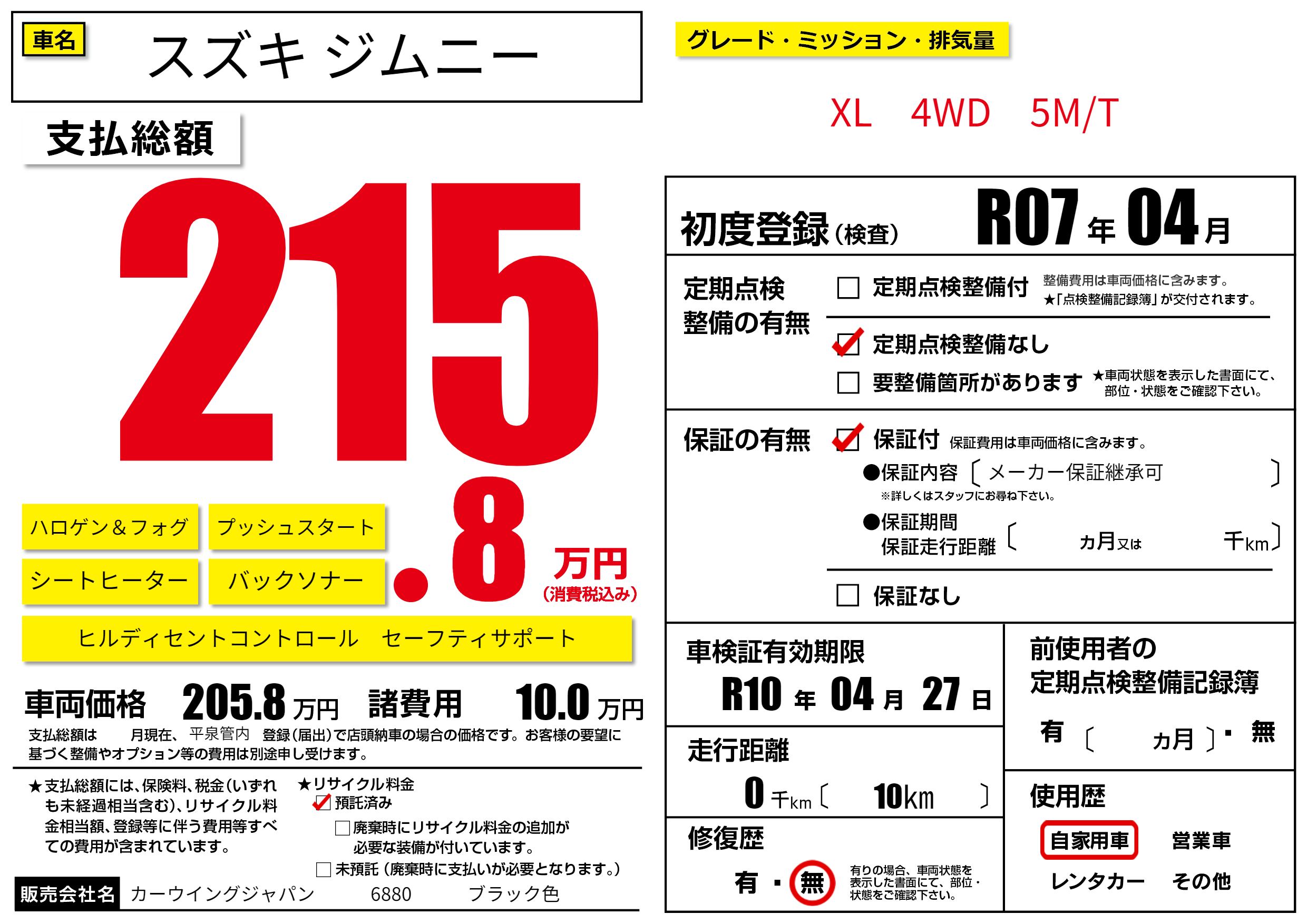 | 車名 | スズキ ジムニー | グレード ミッション 排気量 |