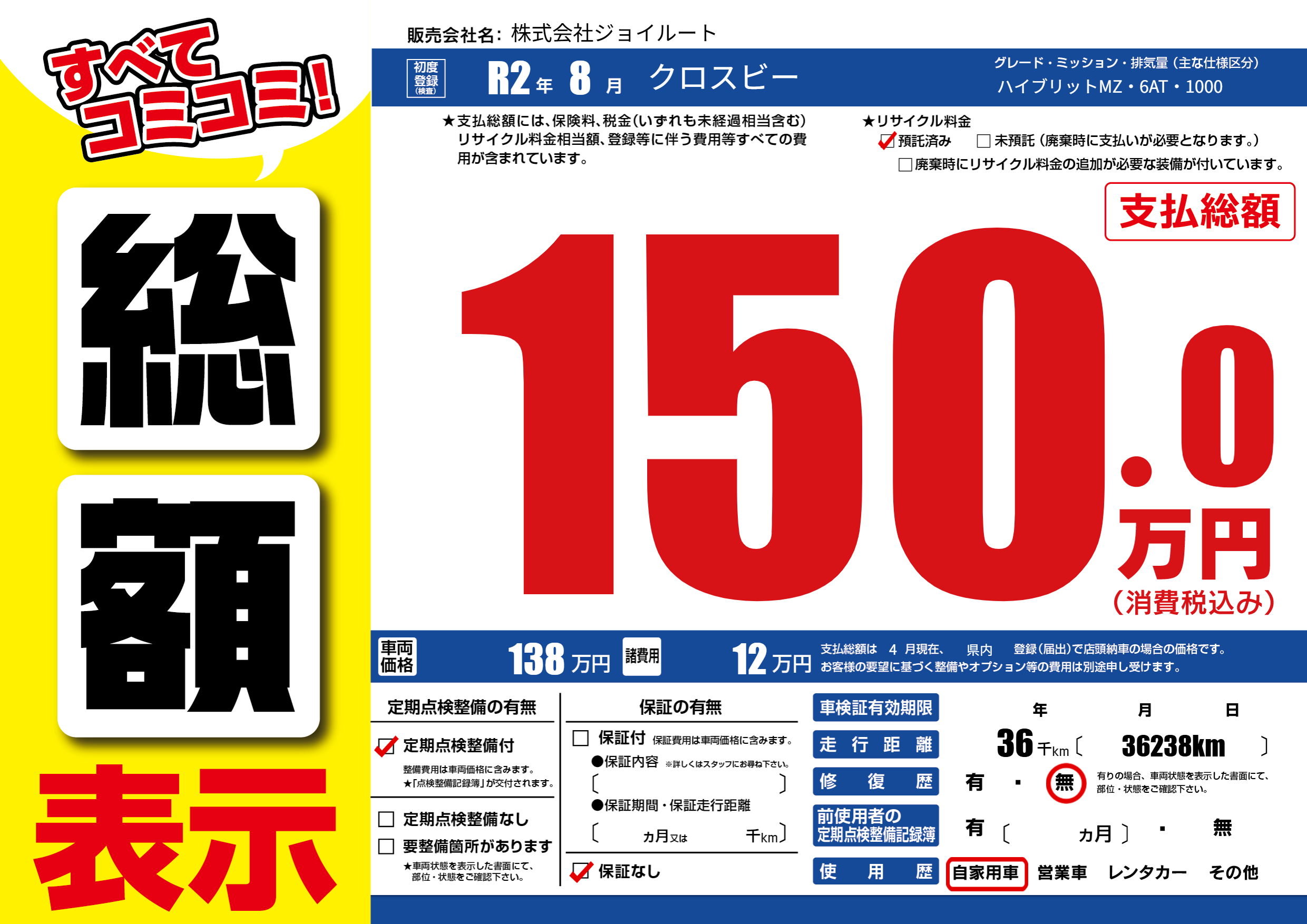 | 車名 | クロスビー | グレード ミッション 排気量 |