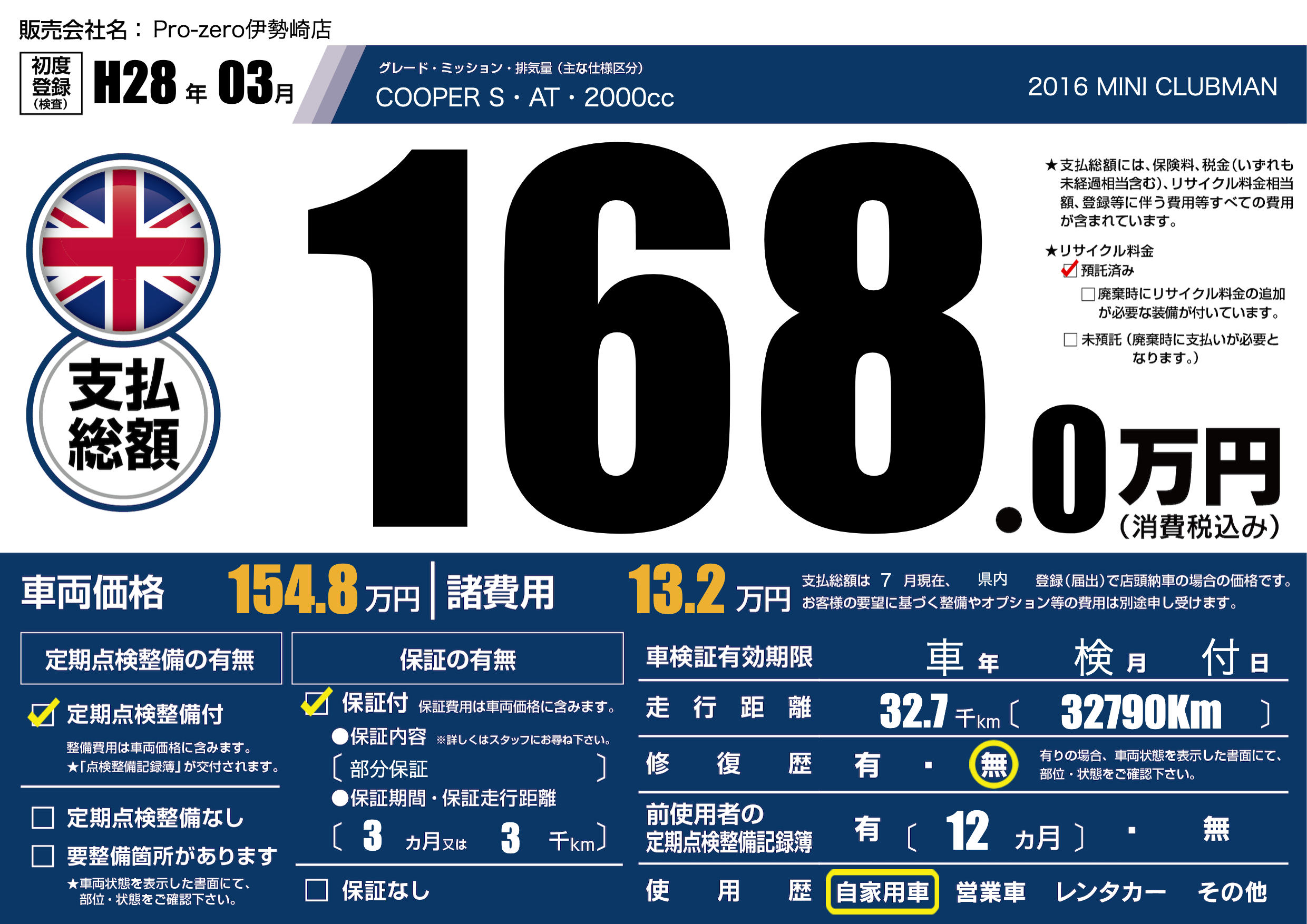 | 車名 | 2016 MINI CLUBMAN | グレード ミッション 排気量 |