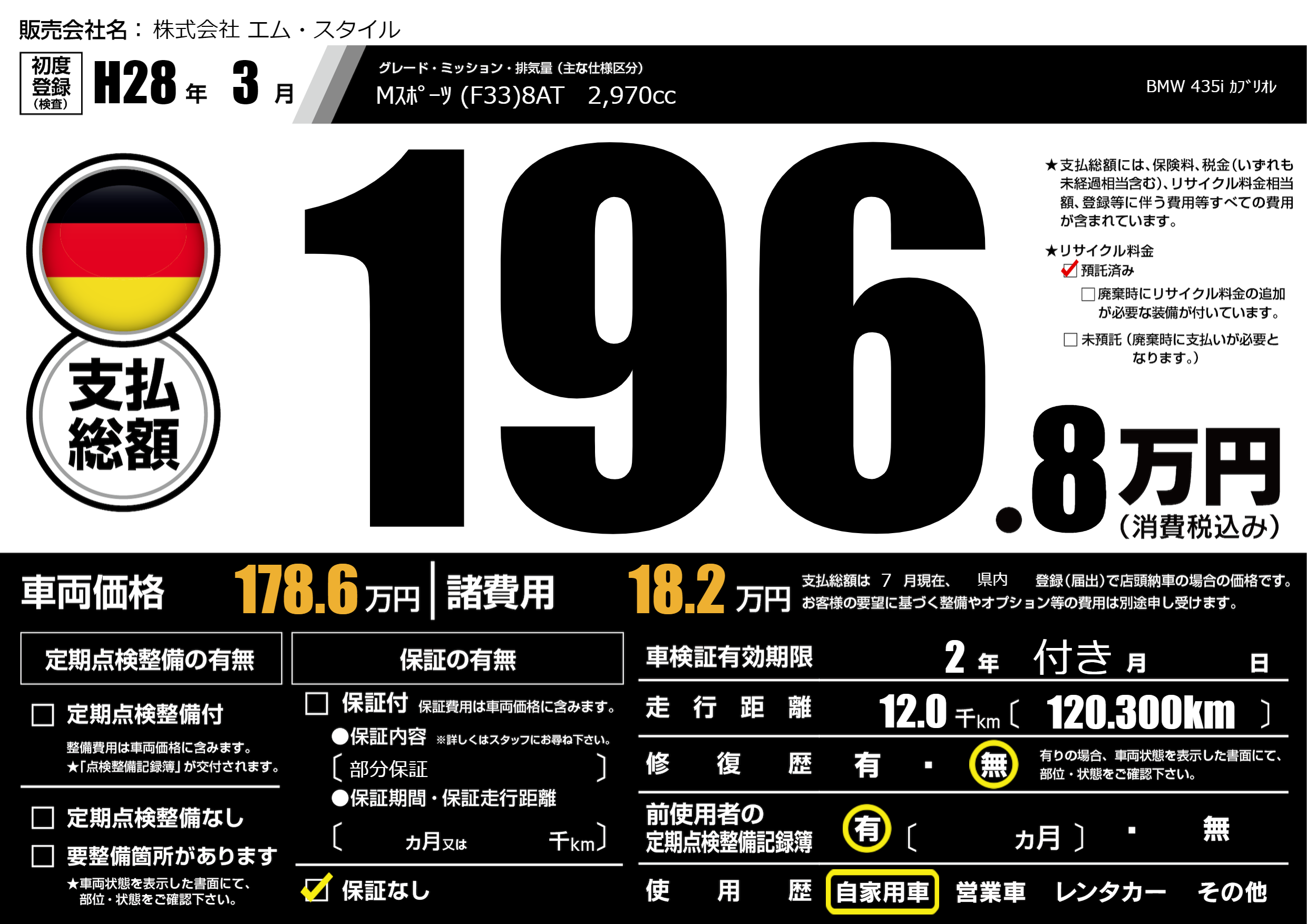 | 車名 | BMW 435i カブリオレ | グレード ミッション 排気量 |