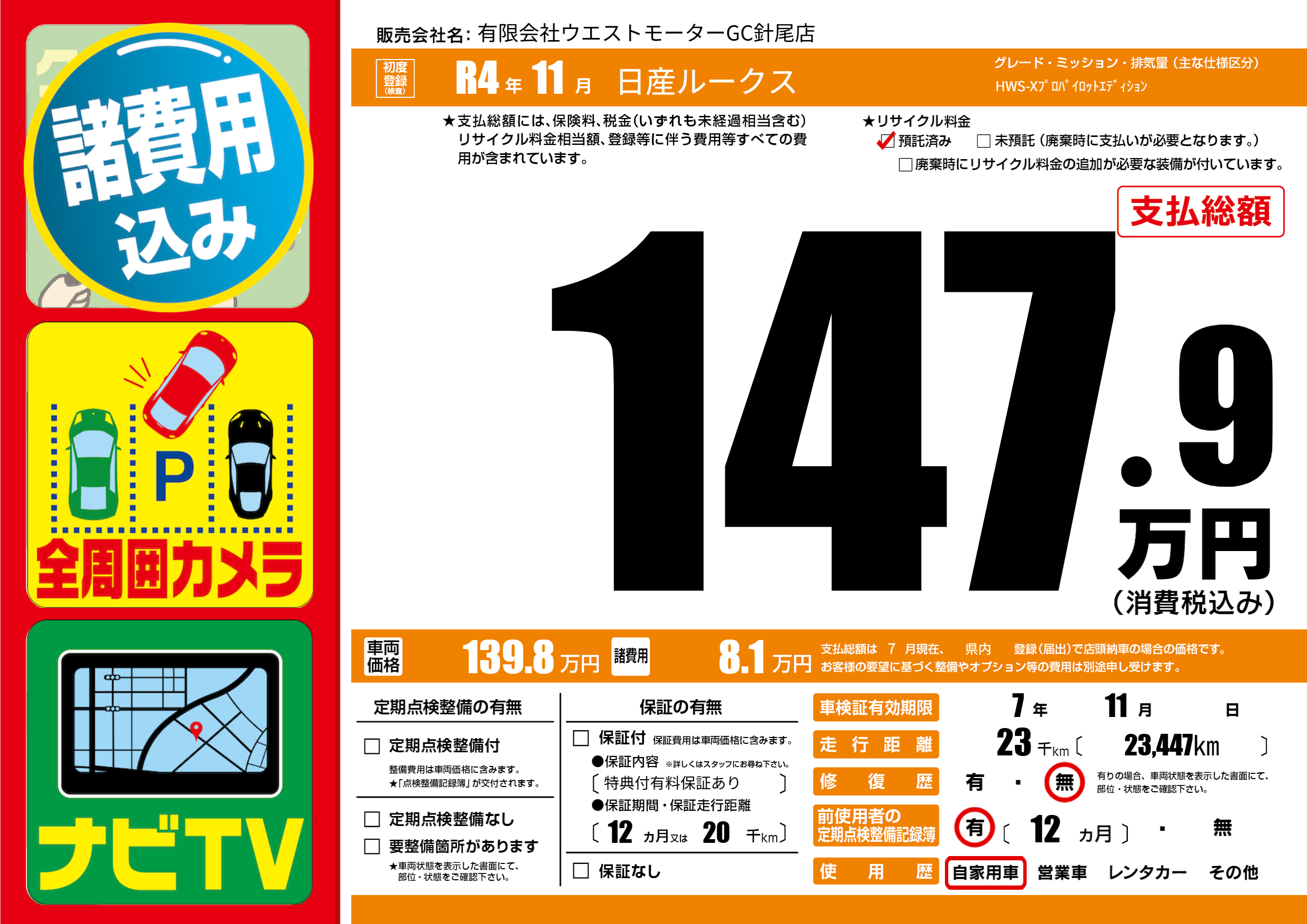 | 走行キロ | 2.3万km | 初年度登録 | R4年11月 |