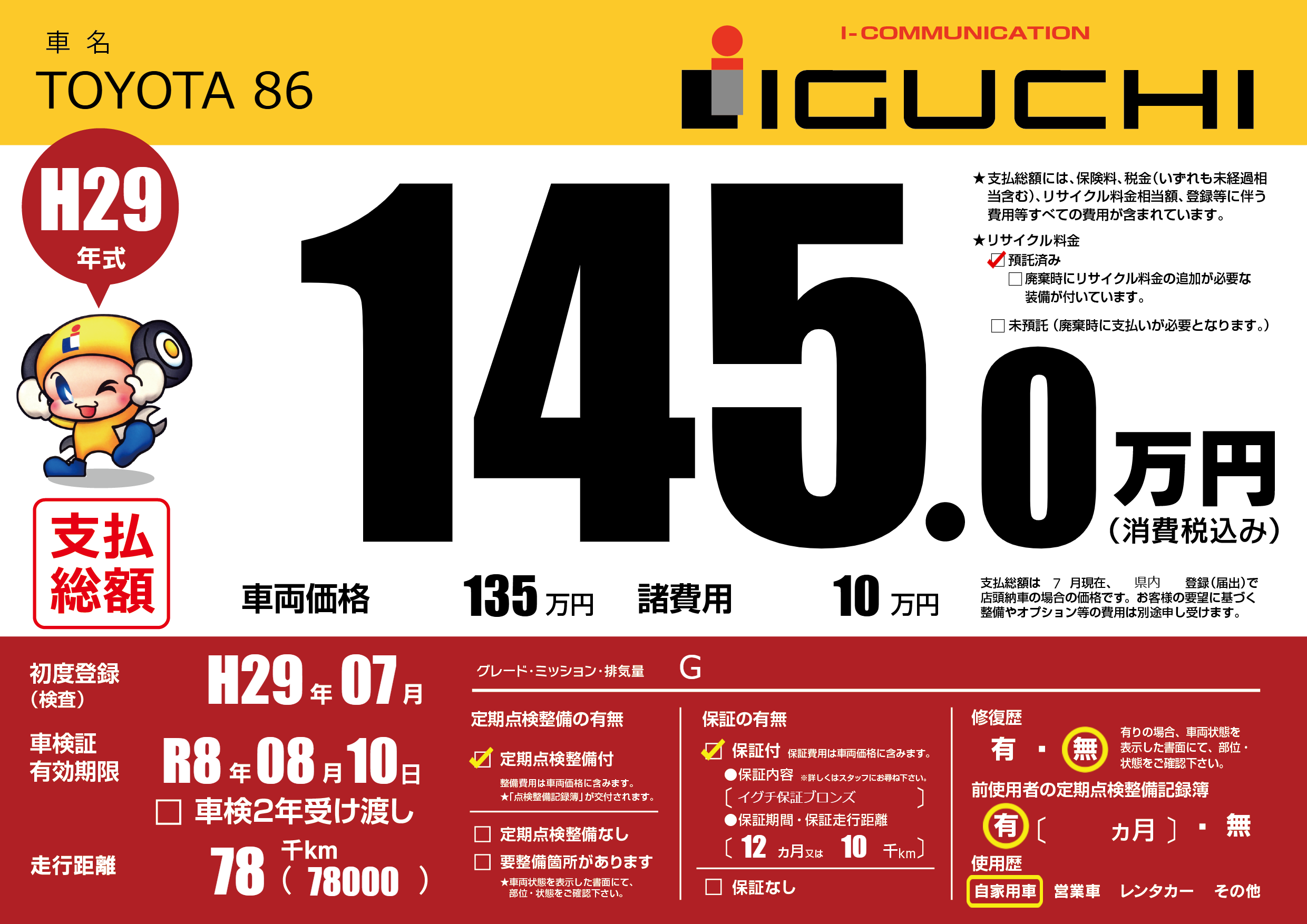 | 車名 | TOYOTA 86 | グレード ミッション 排気量 |