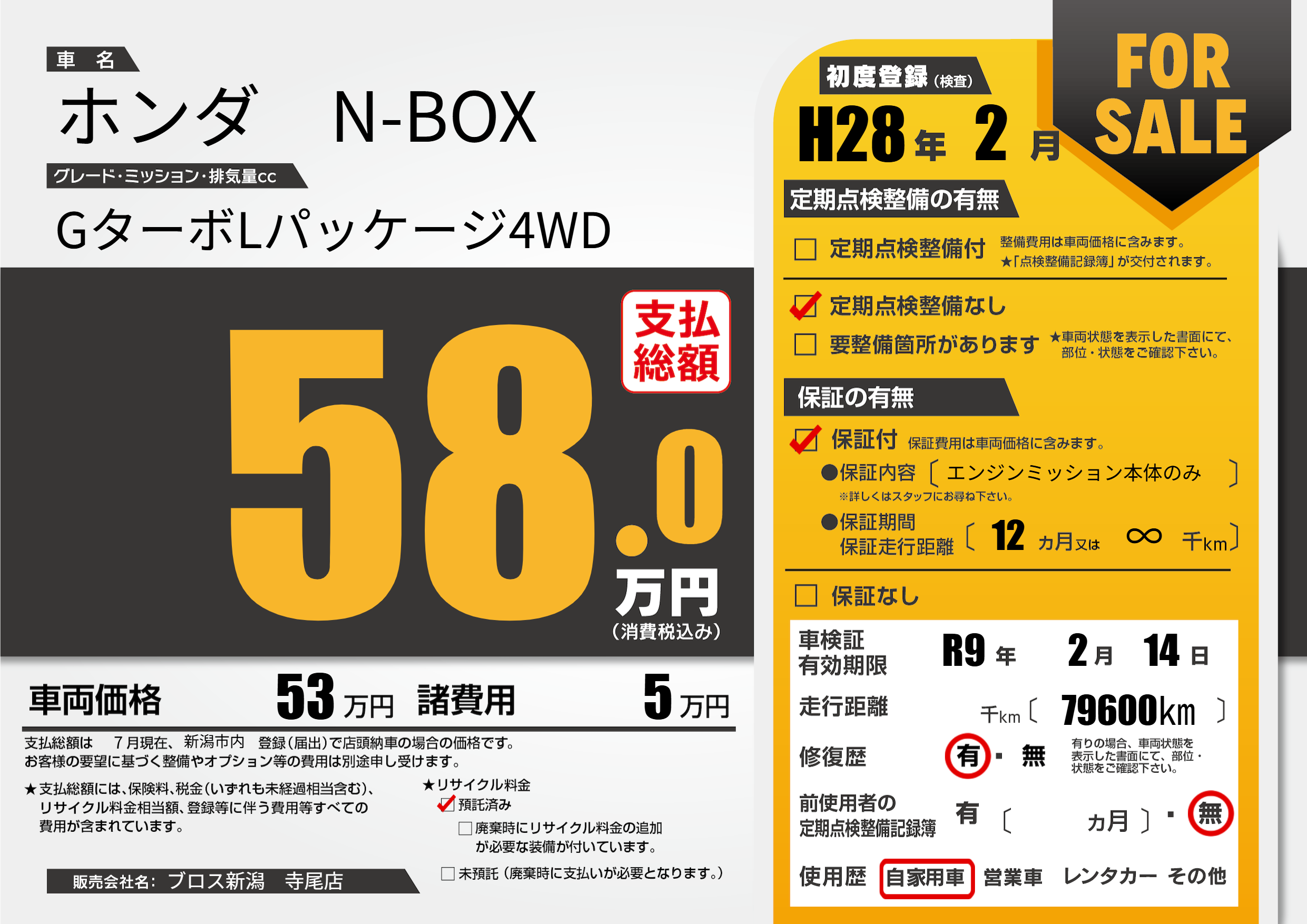 | 車名 | ホンダ N-BOX | グレード ミッション 排気量 |