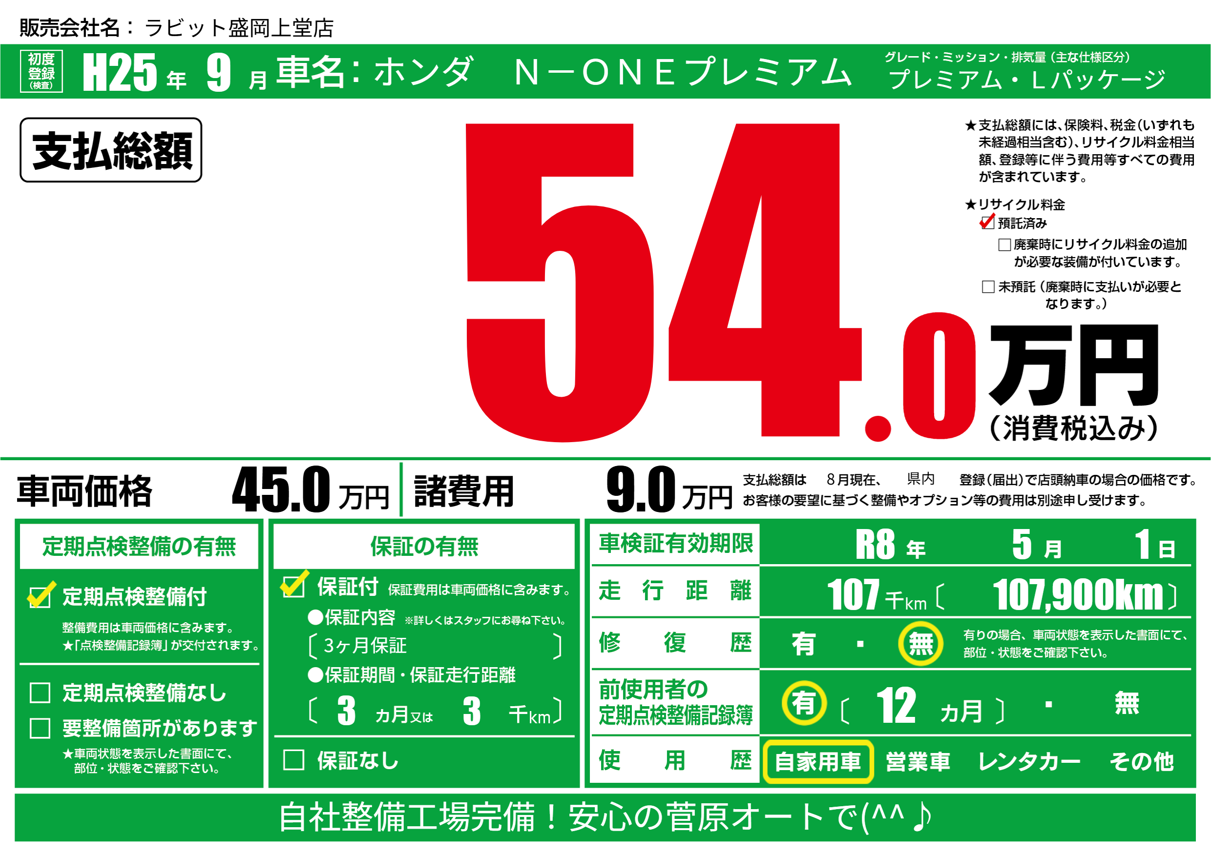 | 車名 | ホンダ N-ONEプレミアム | グレード ミッション 排気量 |