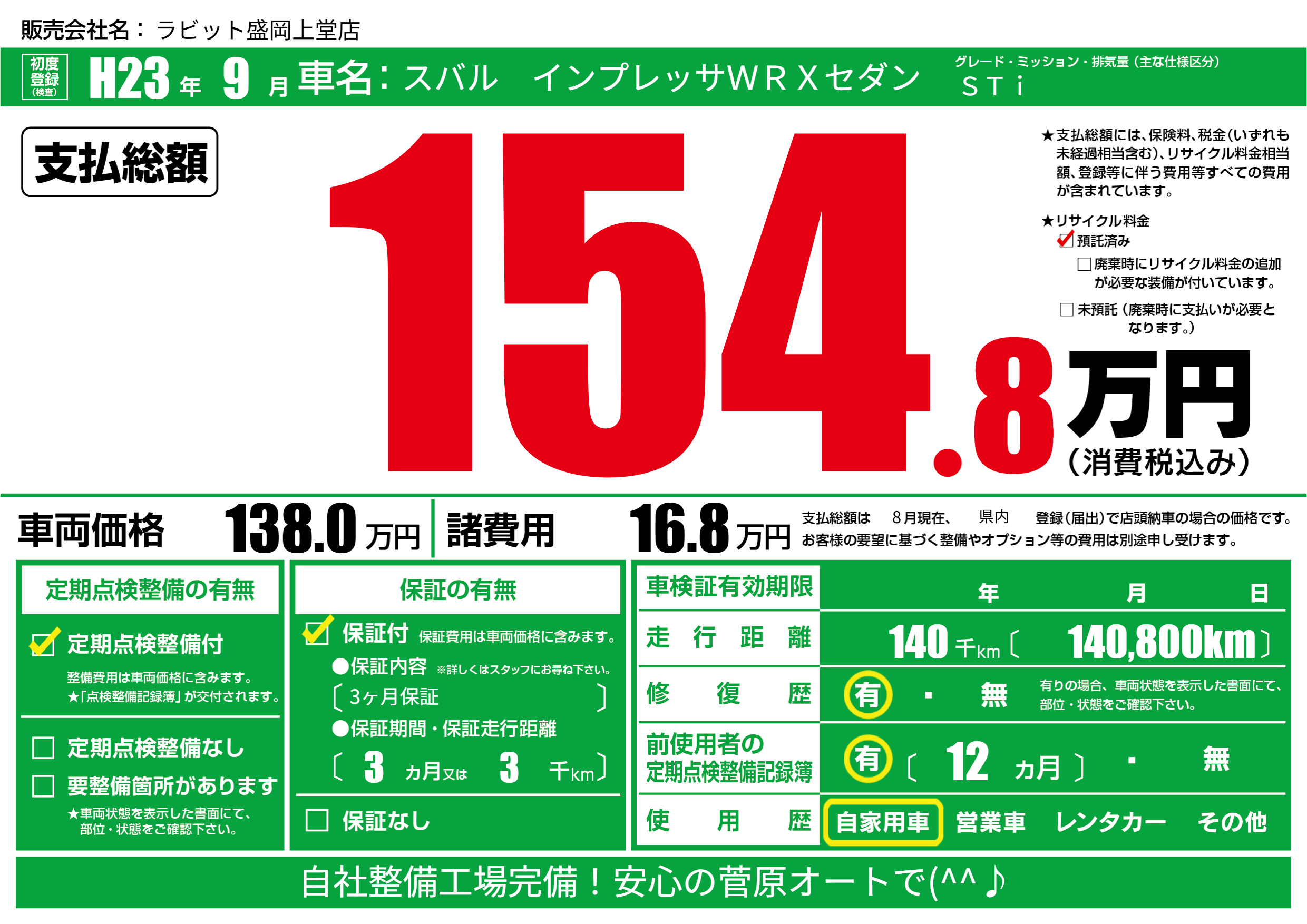 | 車名 | スバル インプレッサWRXセダン | グレード ミッション 排気量 |
