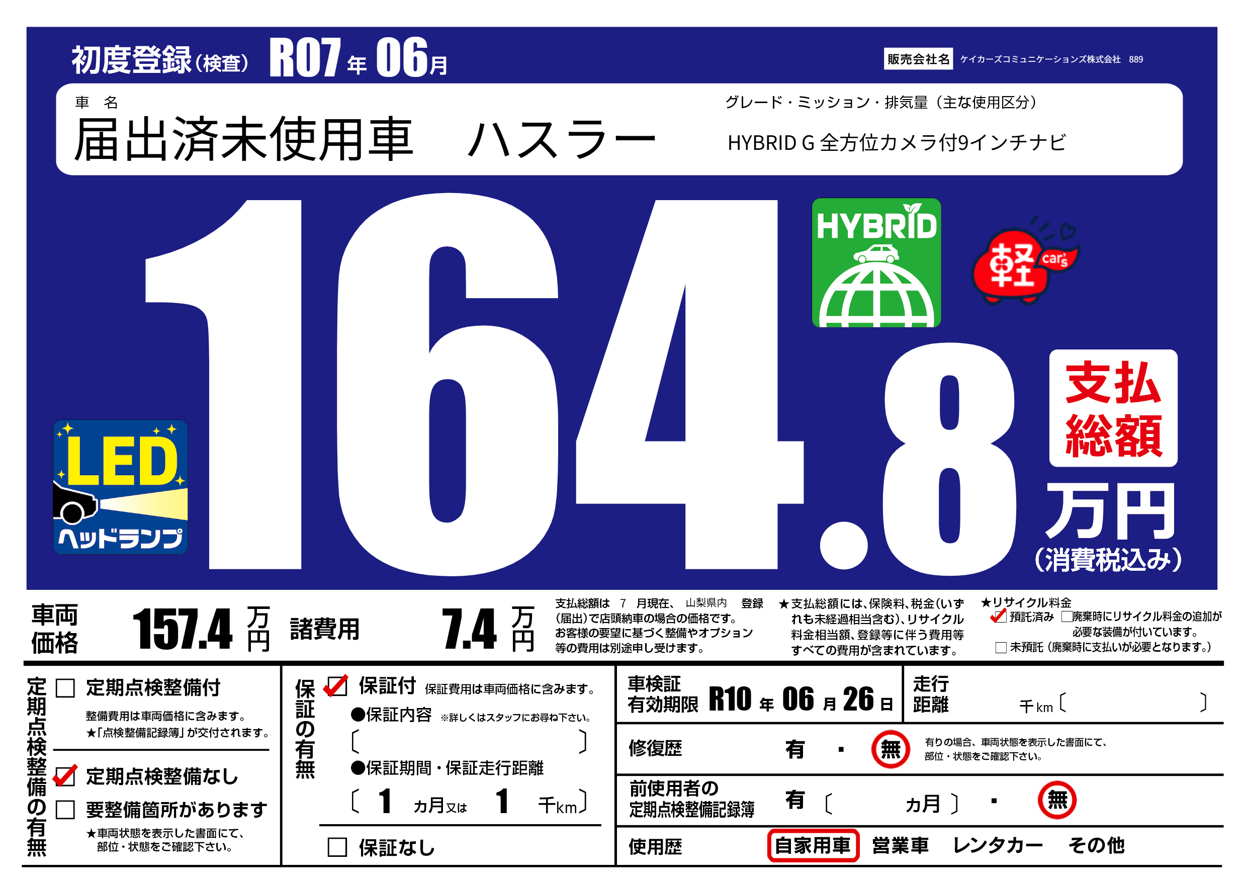 | 車名 | 届出済未使用車 ハスラー | グレード ミッション 排気量 |