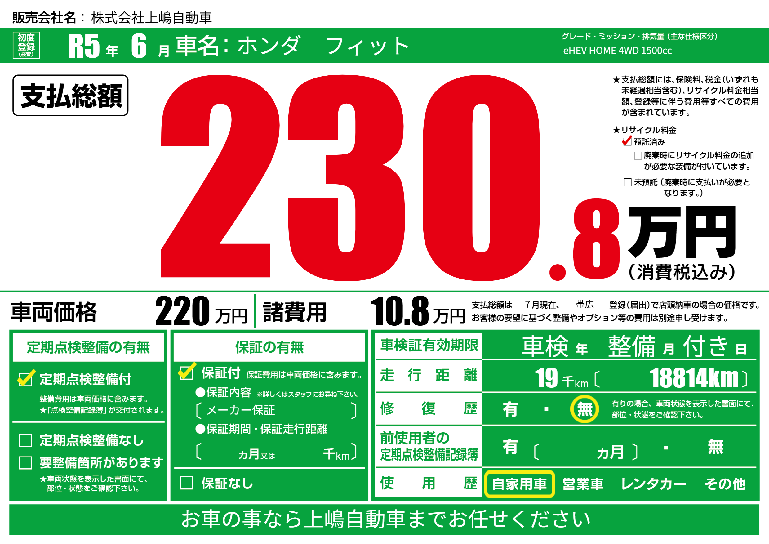| 車名 | ホンダ フィット | グレード ミッション 排気量 |