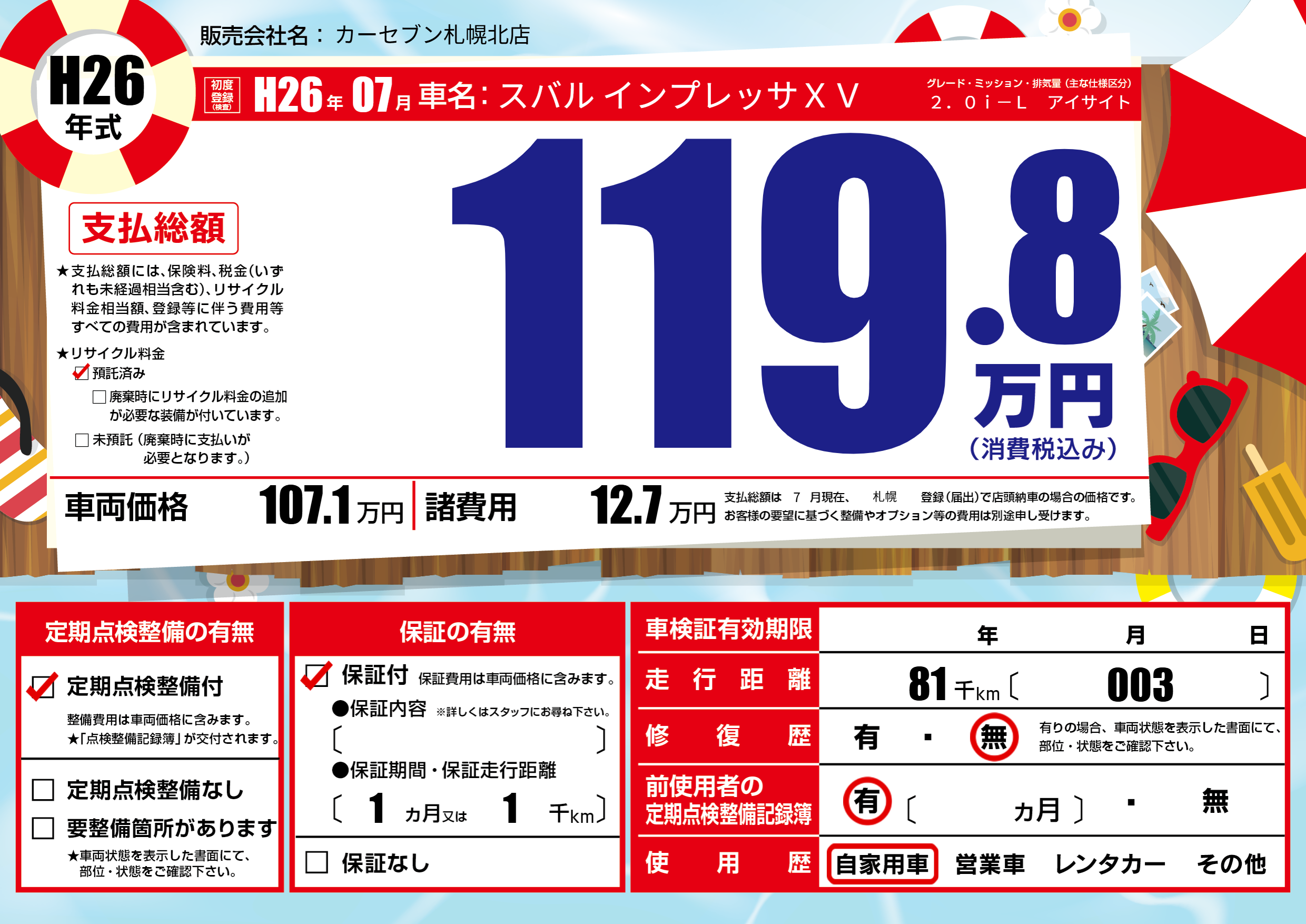| 走行キロ | 8.1万km | 初年度登録 | H26年07月 |