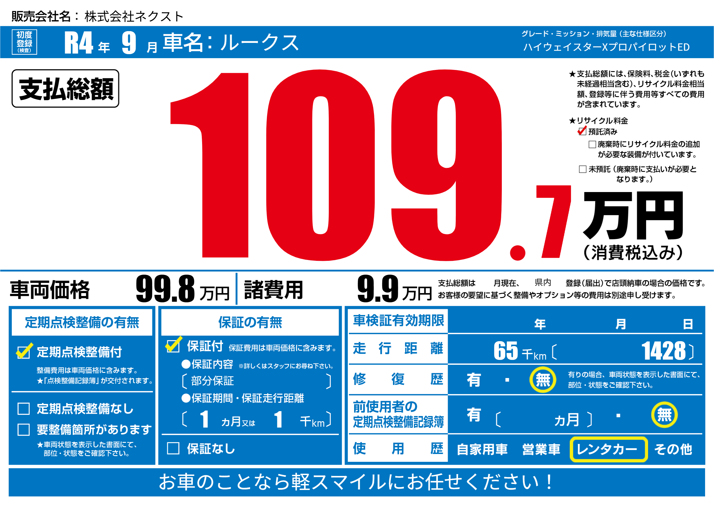 | 走行キロ | 6.5万km | 初年度登録 | R4年9月 |