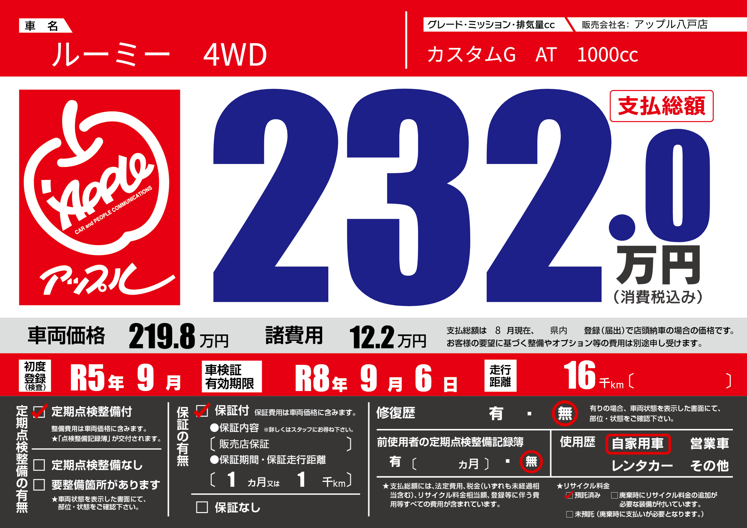 | 走行キロ | 1.6万km | 初年度登録 | R5年9月 |