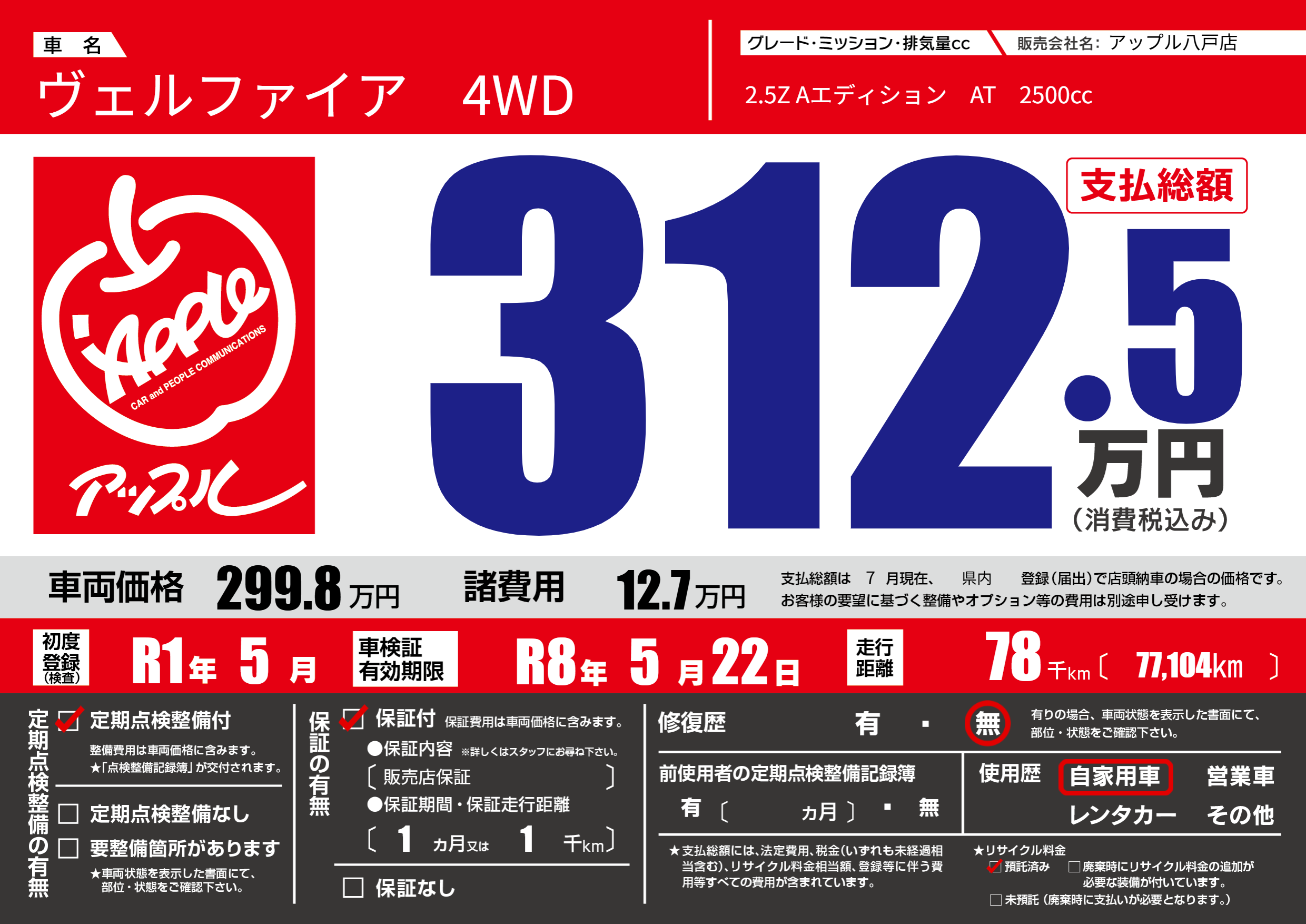 | 車名 | ヴェルファイア 4WD | グレード ミッション 排気量 |