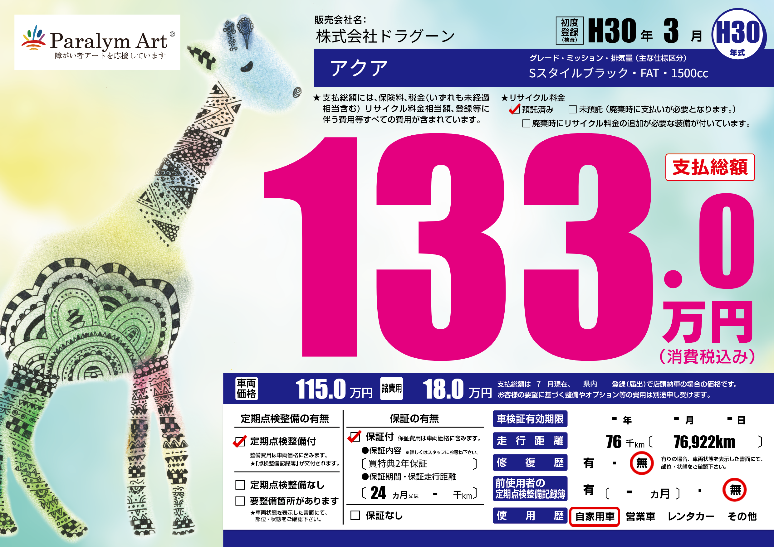 | 走行キロ | 7.6万km | 初年度登録 | H30年3月 |