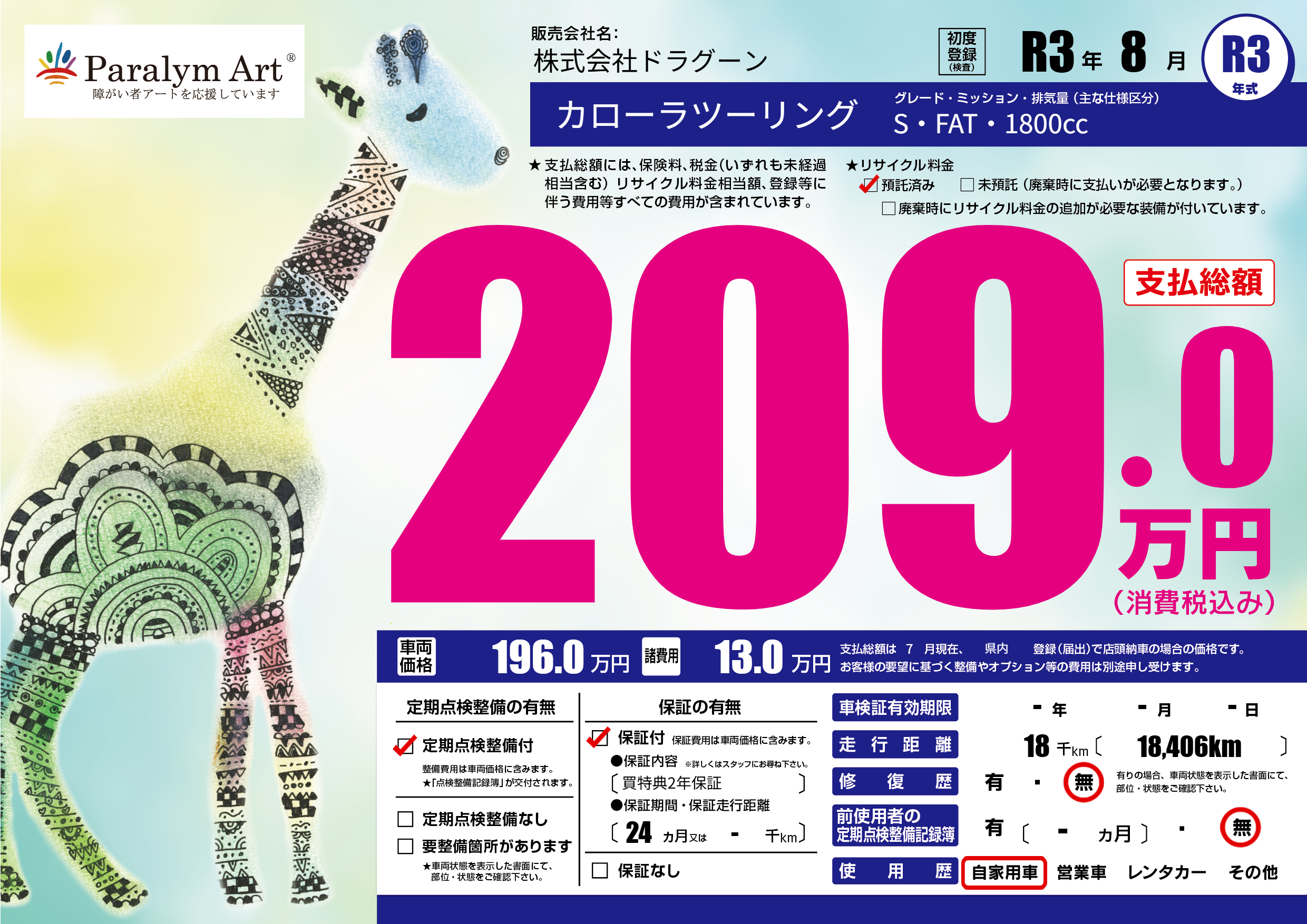 | 車名 | カローラツーリング | グレード ミッション 排気量 |