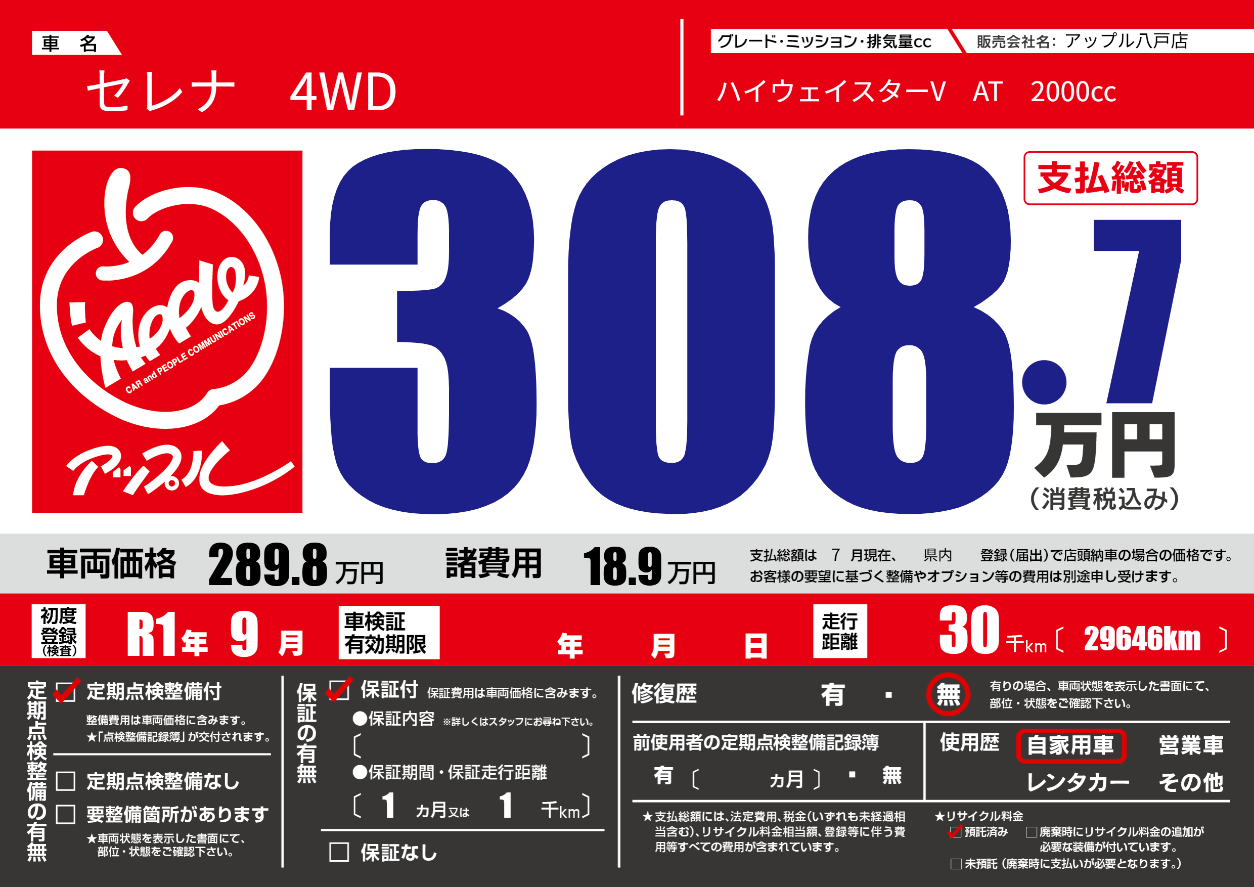 | 走行キロ | 3万km | 初年度登録 | R1年9月 |