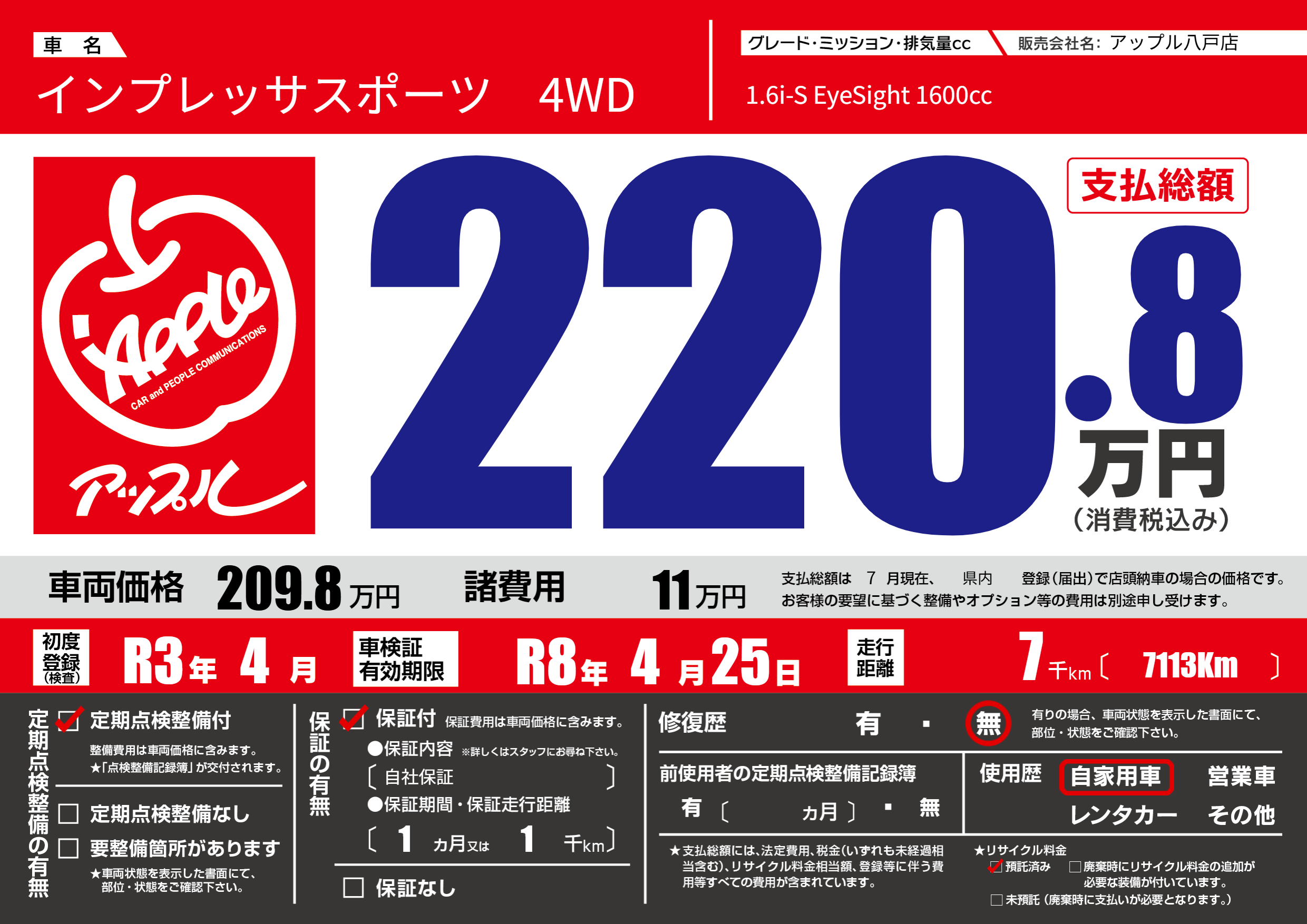 | 車名 | インプレッサスポーツ 4WD | グレード ミッション 排気量 |