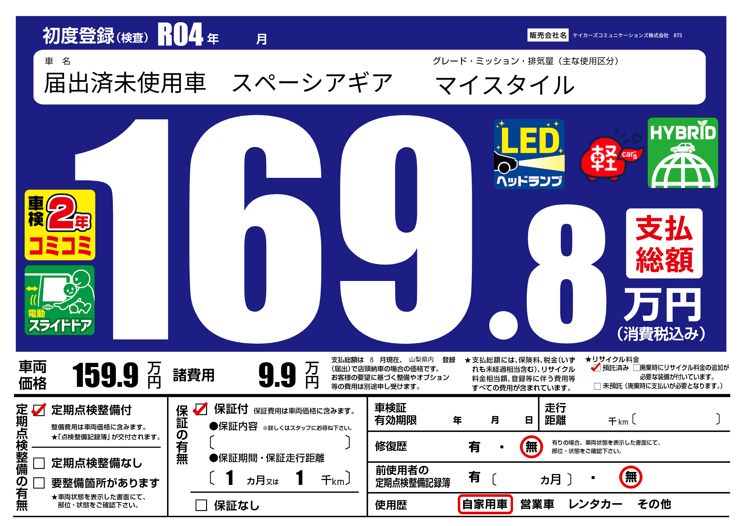 | 車名 | 届出済未使用車 スペーシアギア | グレード ミッション 排気量 |