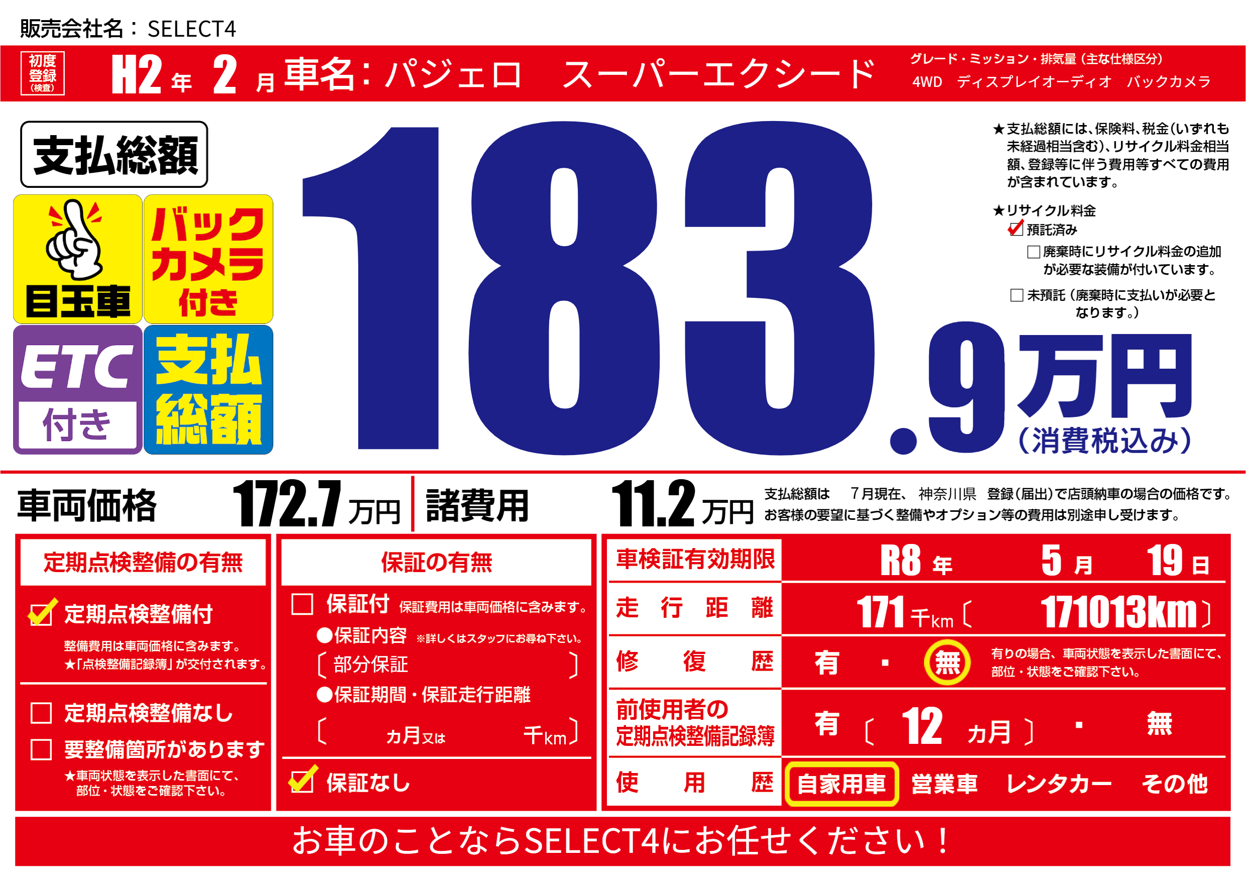 | 車名 | パジェロ スーパーエクシード | グレード ミッション 排気量 |