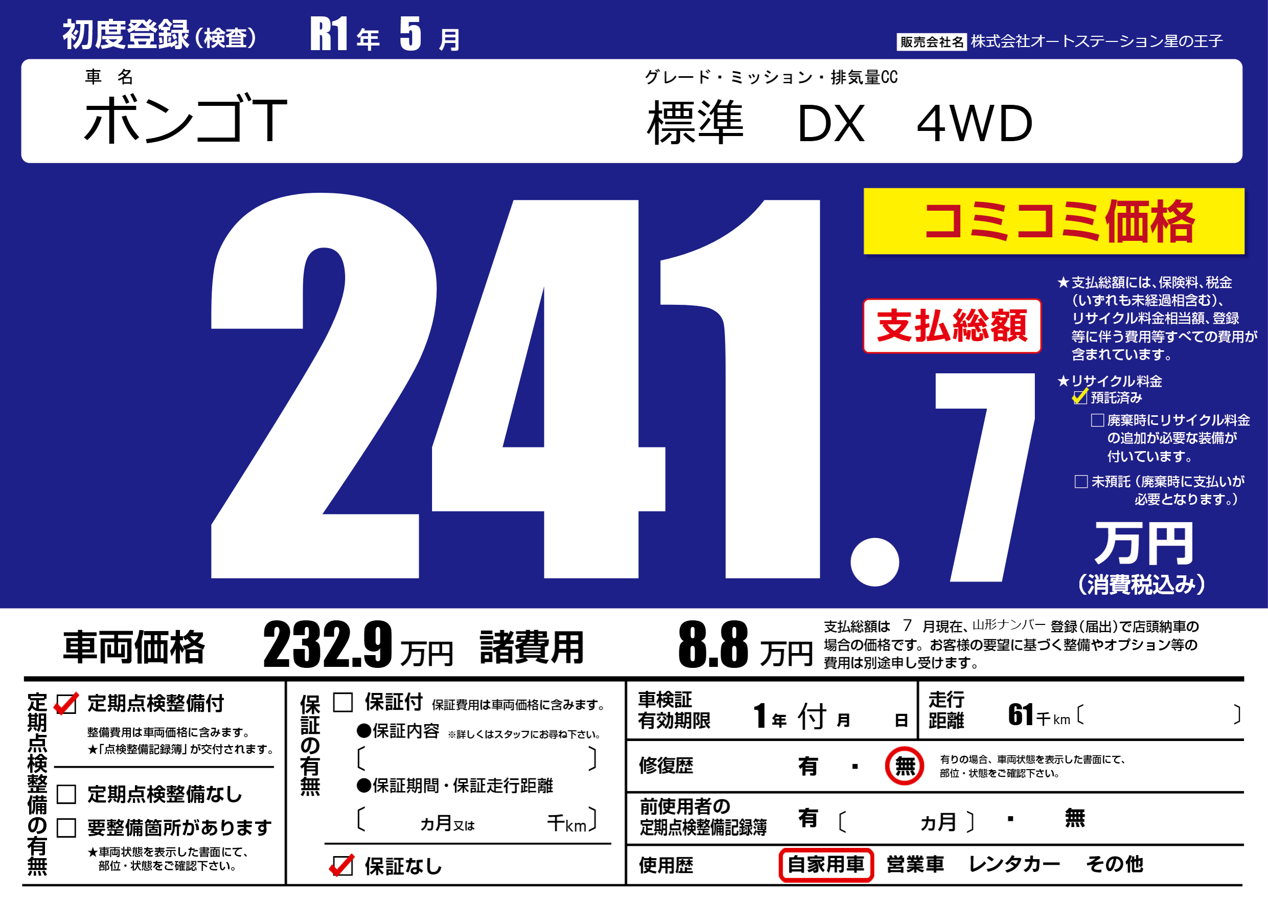 | 車名 | ボンゴT | グレード ミッション 排気量 |
