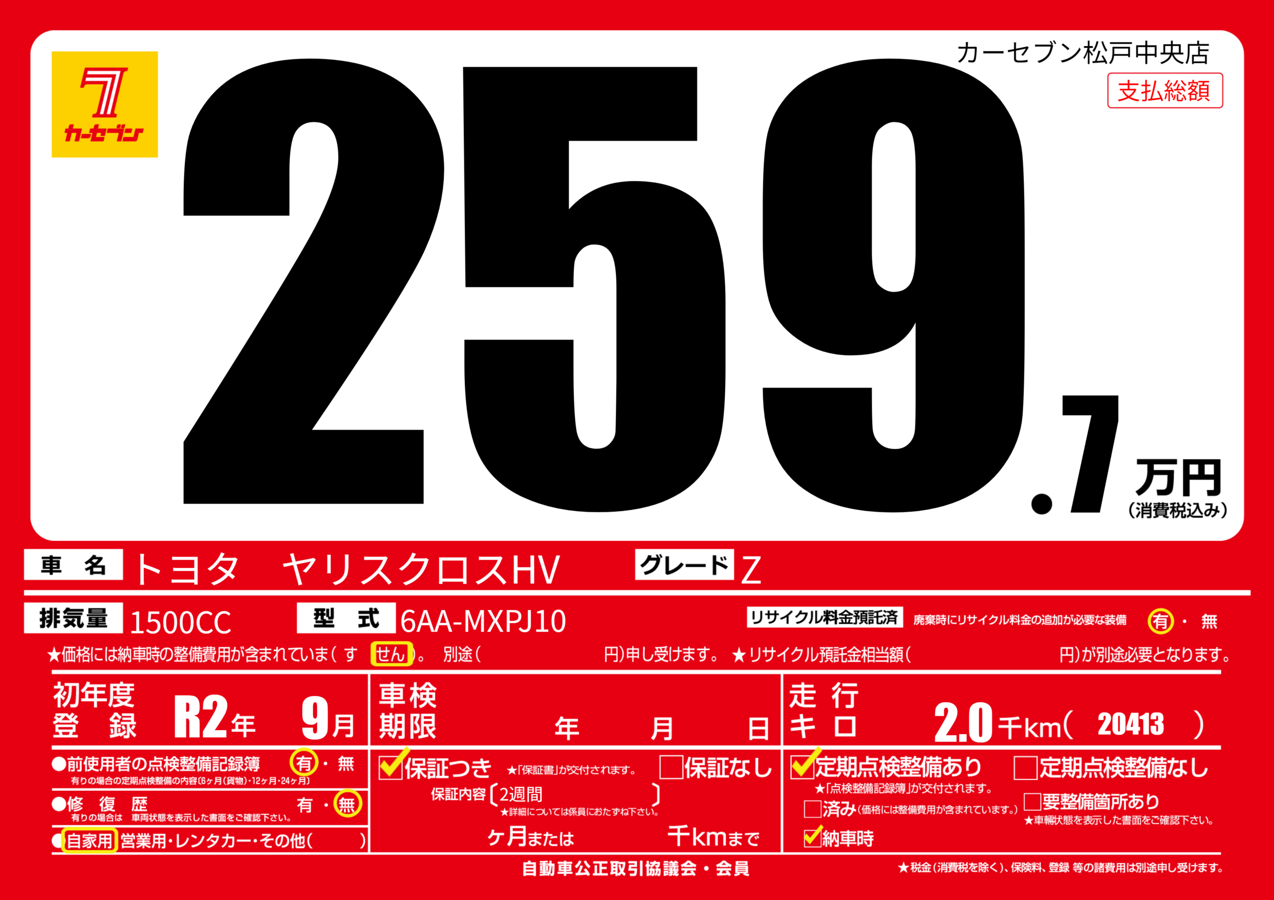| 車名 | トヨタ ヤリスクロスHV | グレード ミッション 排気量 |