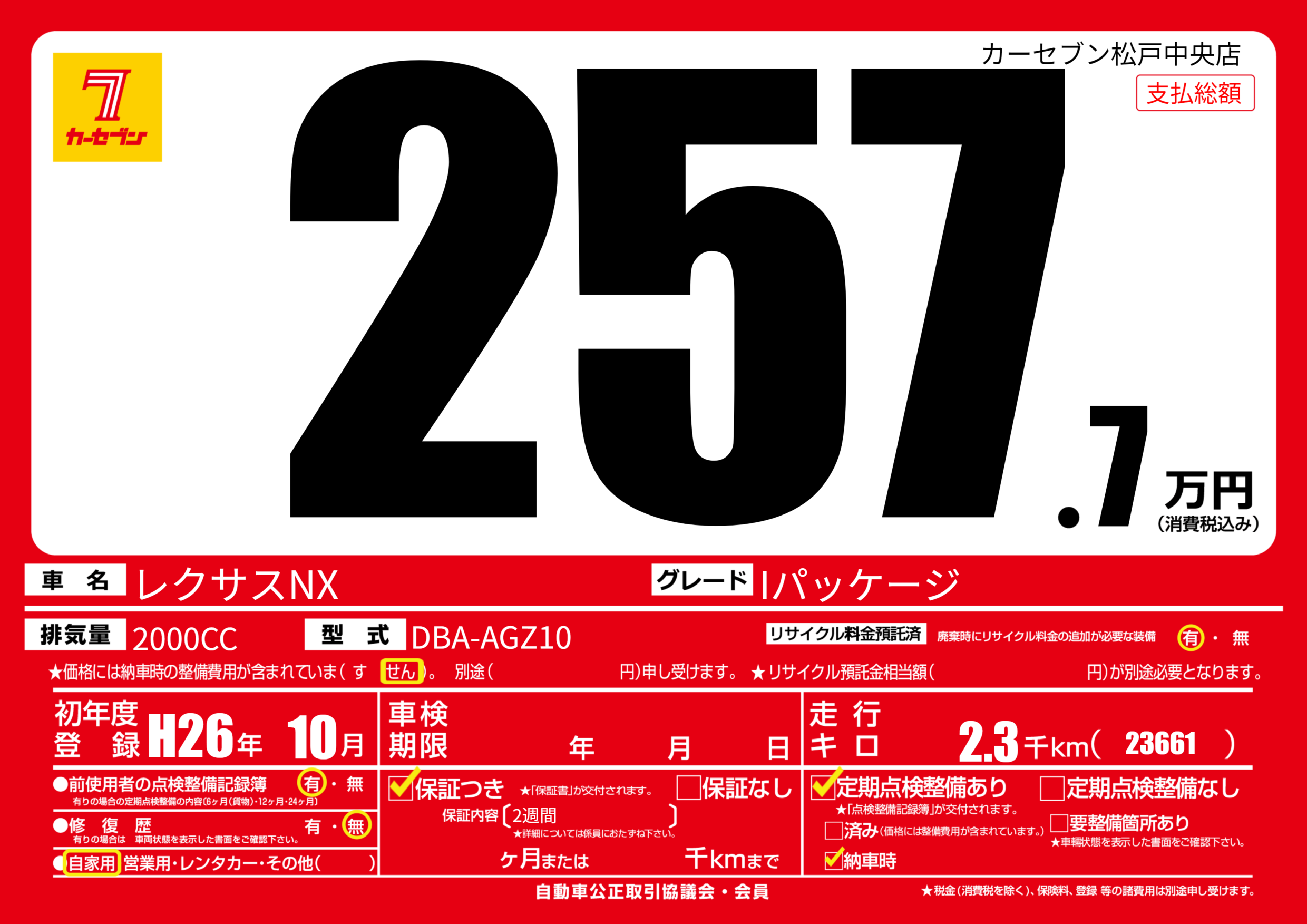 | 車名 | レクサスNX | グレード ミッション 排気量 |
