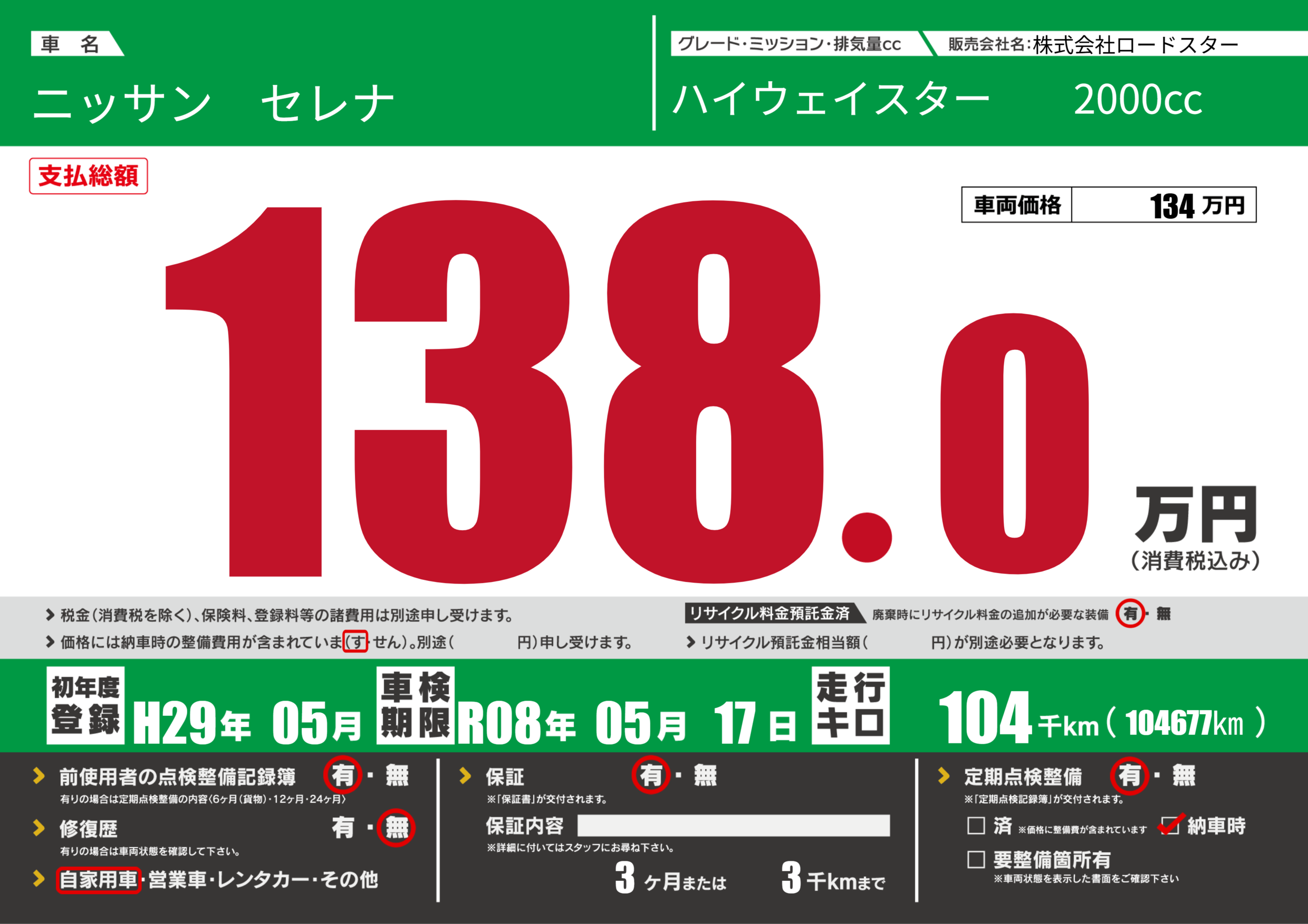 | 定期点検整備 | 定期点検整備あり 納車時あり | ||