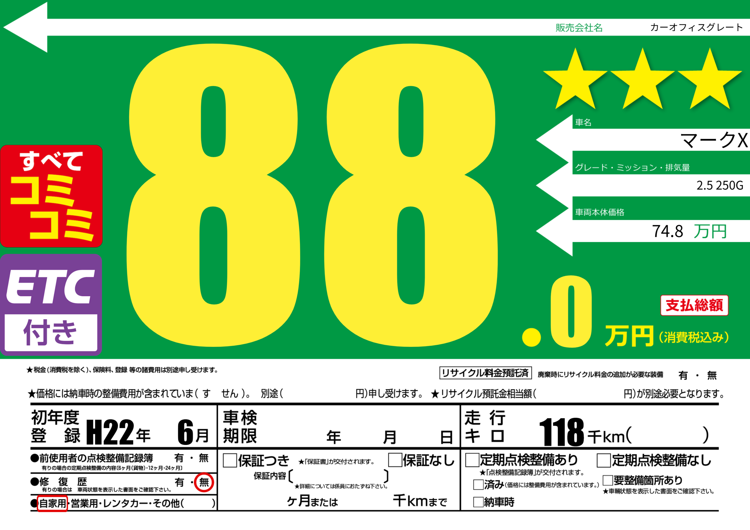| 走行キロ | 11.8万km | 初年度登録 | H22年6月 |