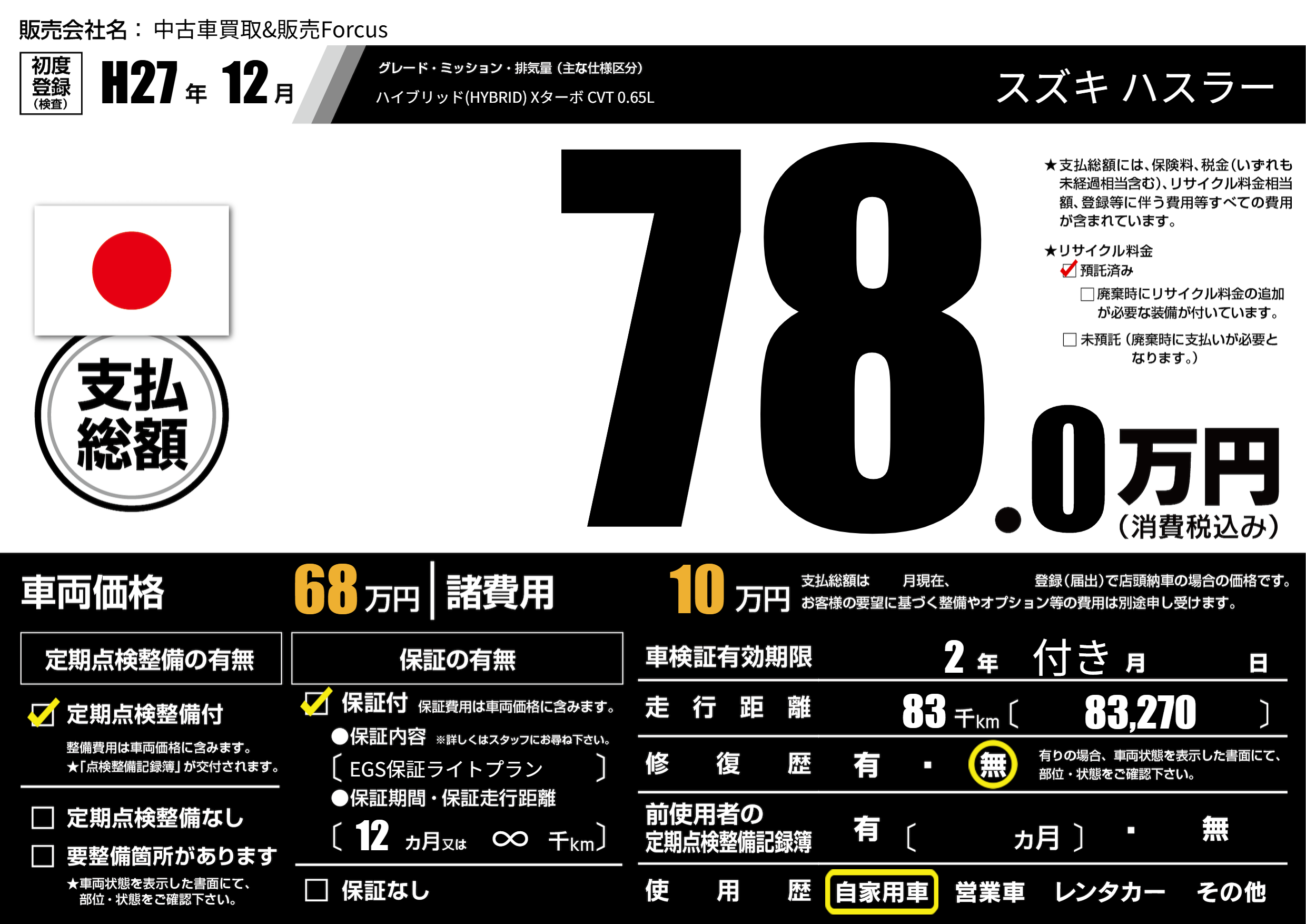 保証付き 保証内容(EGS保証ライトプラン) 12ヶ月または(∞)千kmまで |
