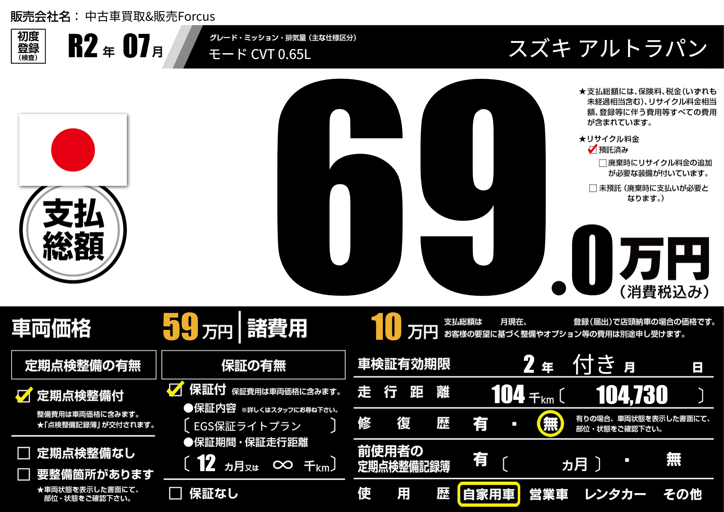 | 走行キロ | 10.4万km | 初年度登録 | R2年07月 |