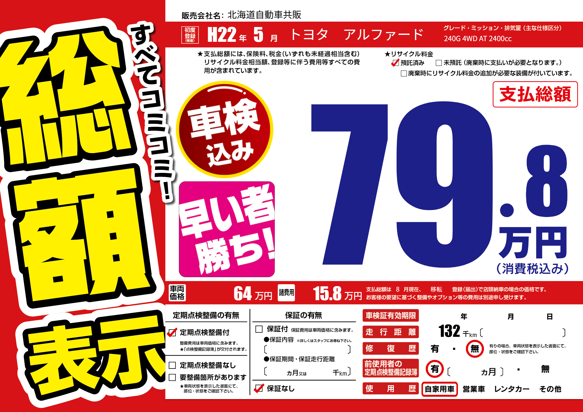 | 走行キロ | 13.2万km | 初年度登録 | H22年5月 |