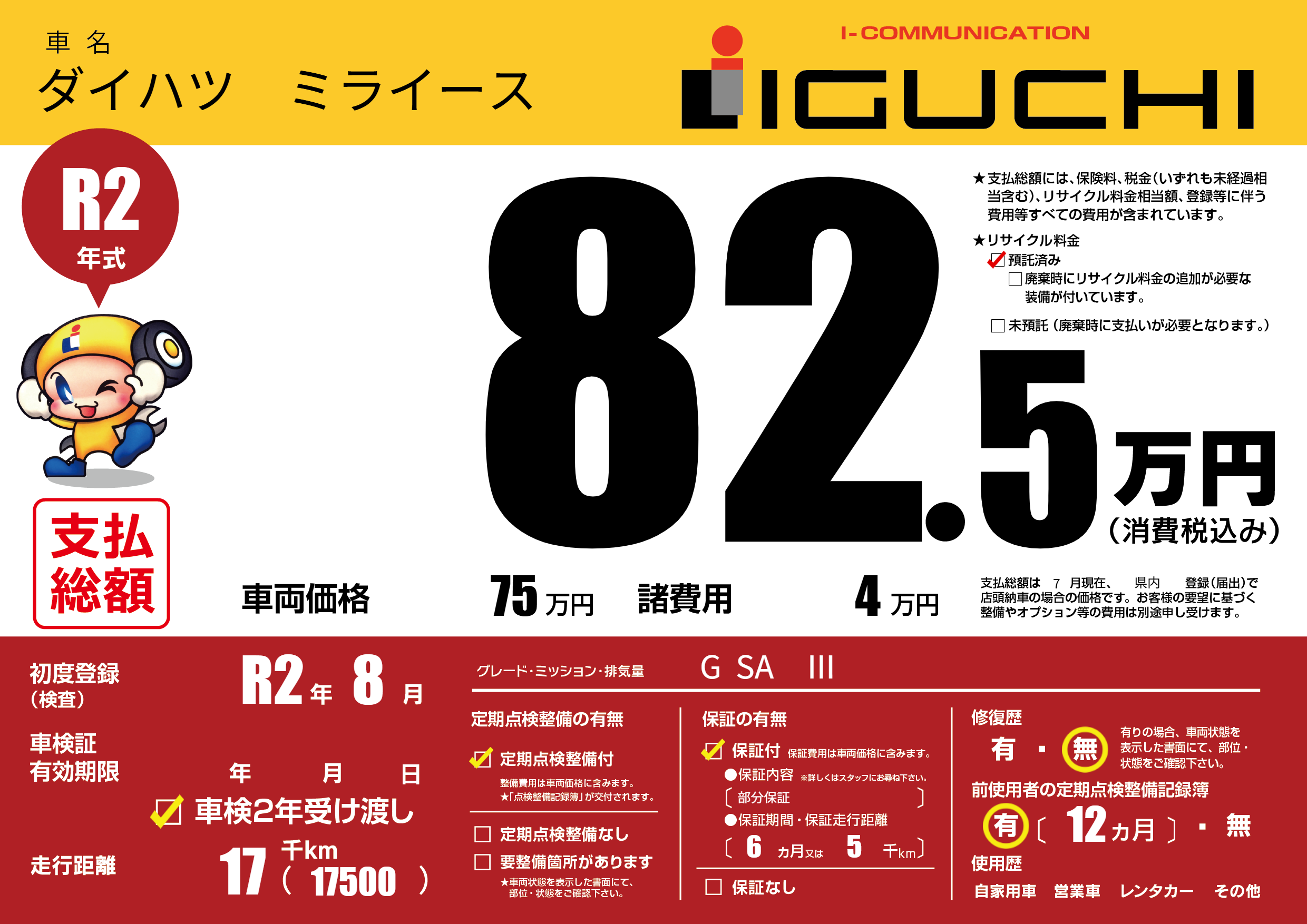| 車名 | ダイハツ ミライース | グレード ミッション 排気量 |
