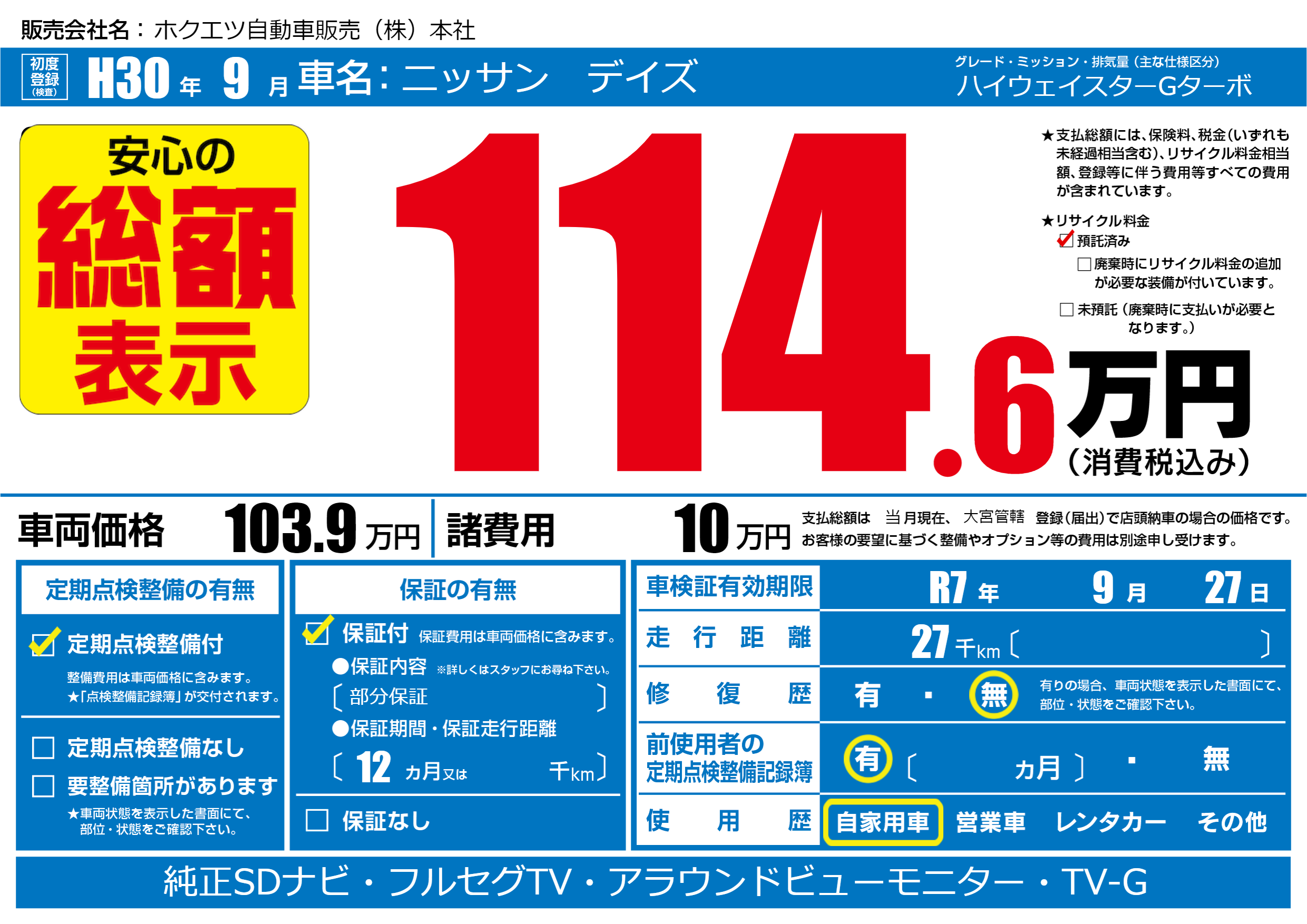 | 走行キロ | 2.7万km | 初年度登録 | H30年9月 |