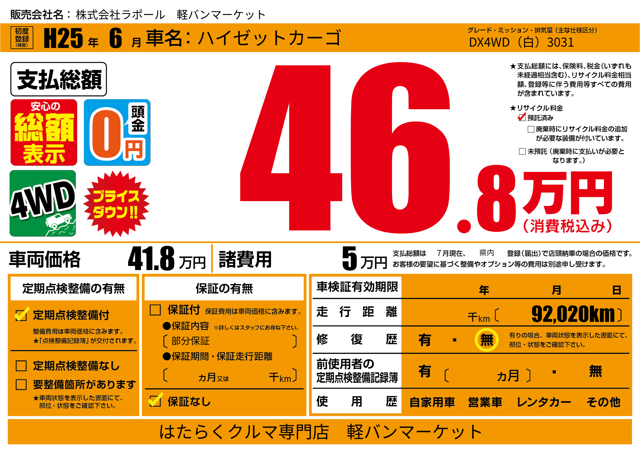 保証なし 保証内容(部分保証) ---ヶ月または()千kmまで |