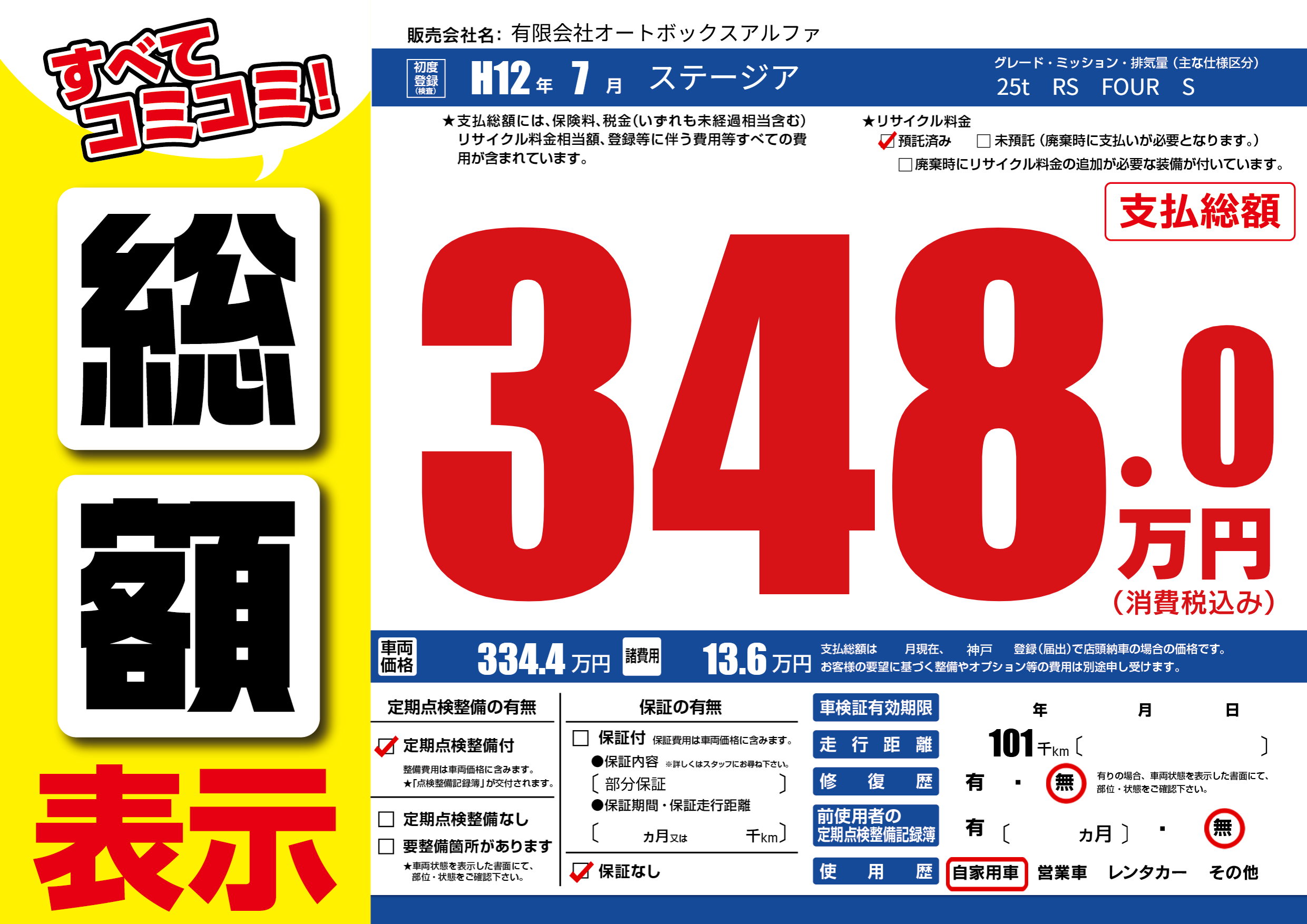 | 車名 | ステージア | グレード ミッション 排気量 |