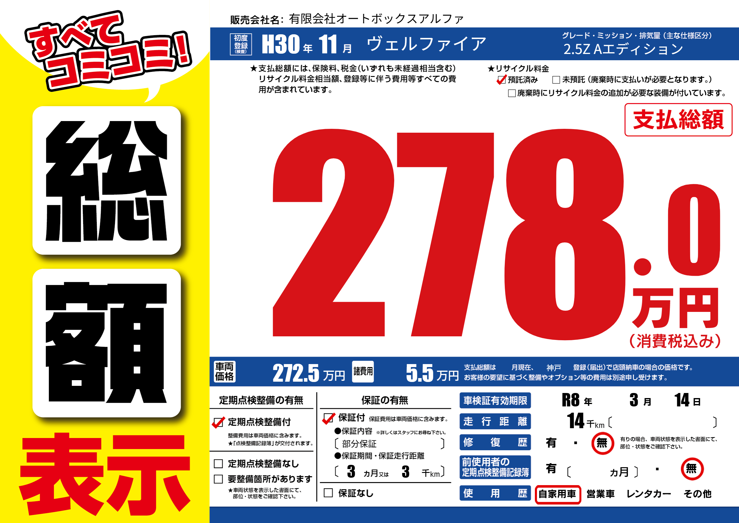 | 車名 | ヴェルファイア | グレード ミッション 排気量 |