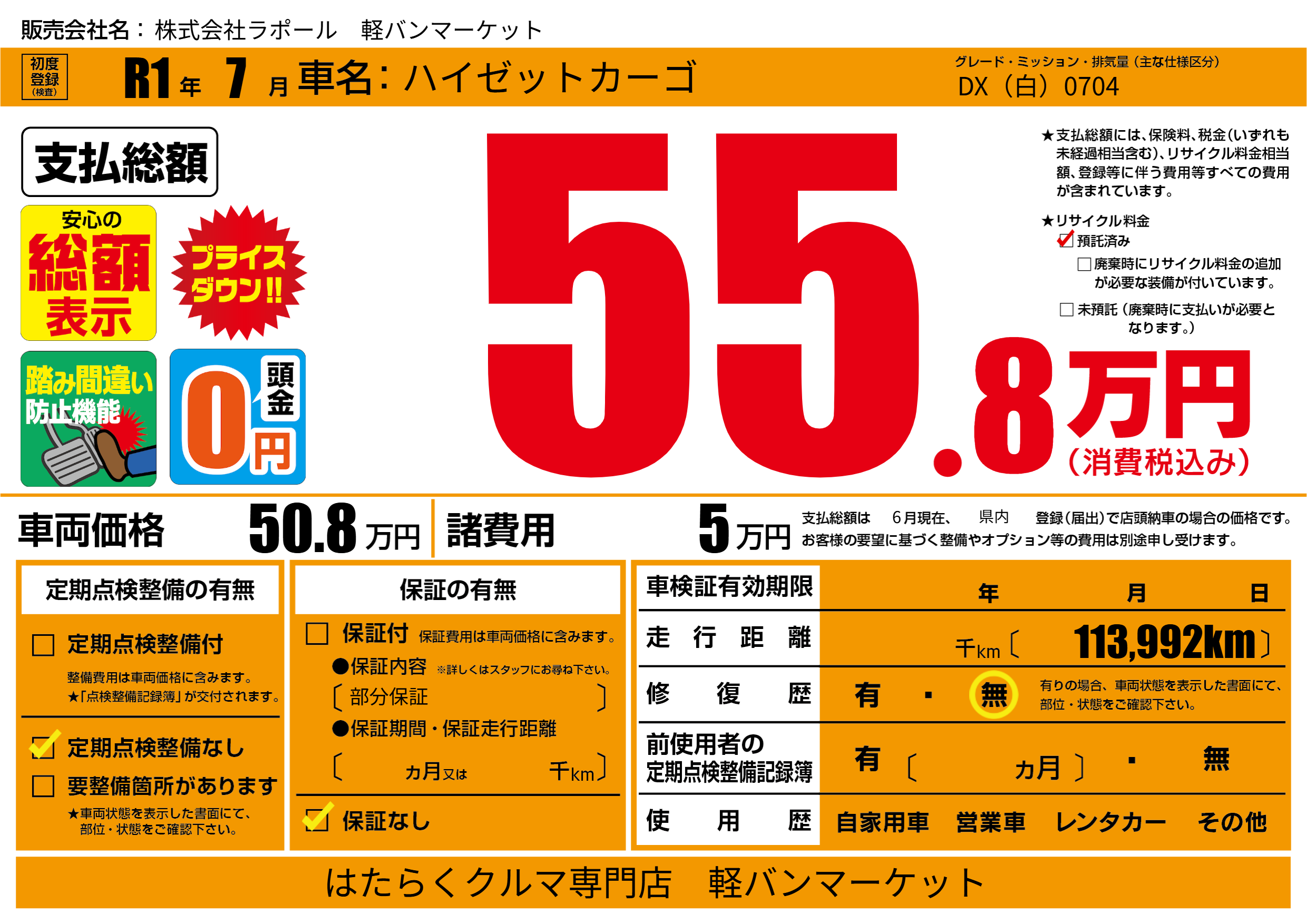 保証なし 保証内容(部分保証) ---ヶ月または()千kmまで |