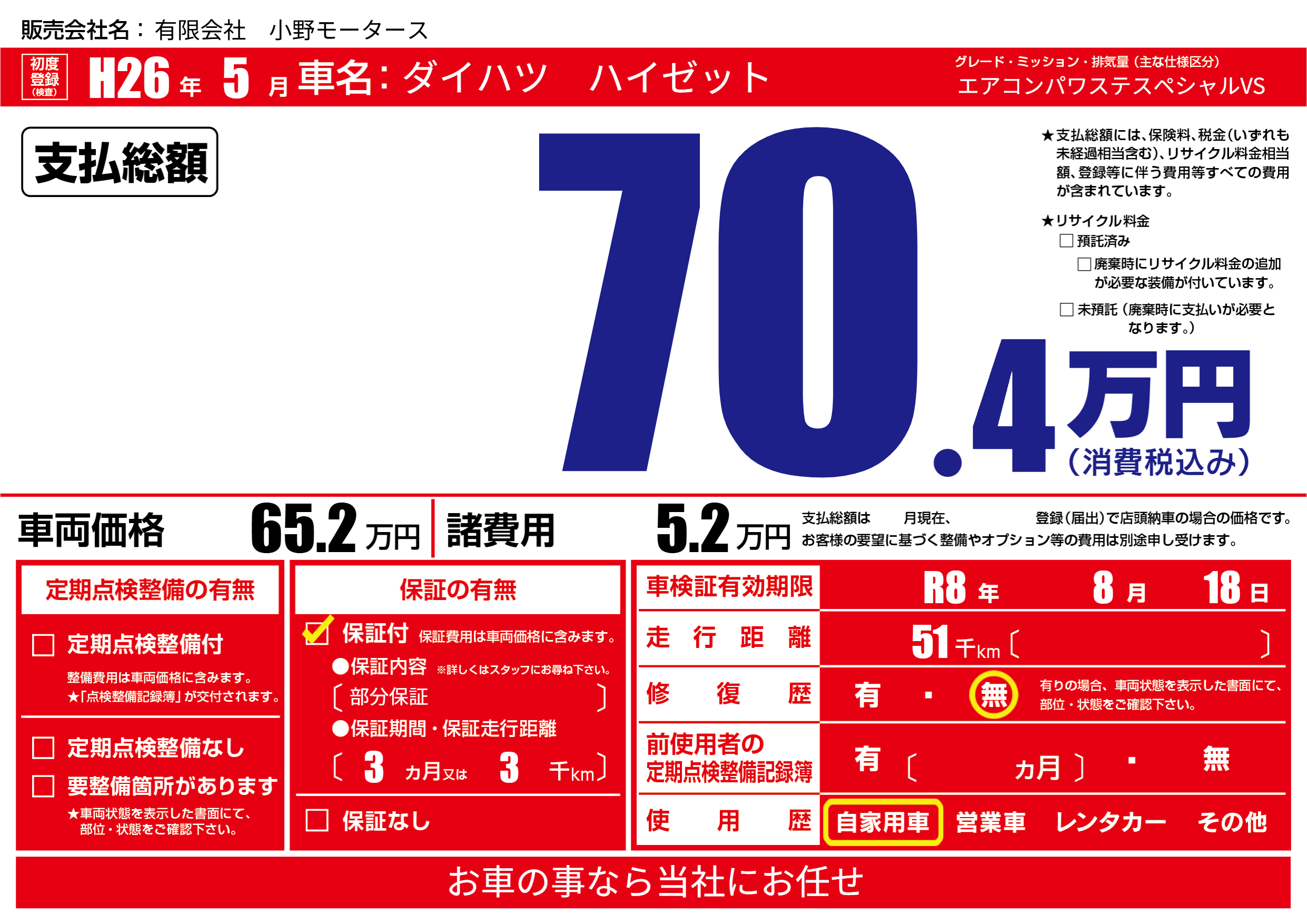 | 車名 | ダイハツ ハイゼット | グレード ミッション 排気量 |