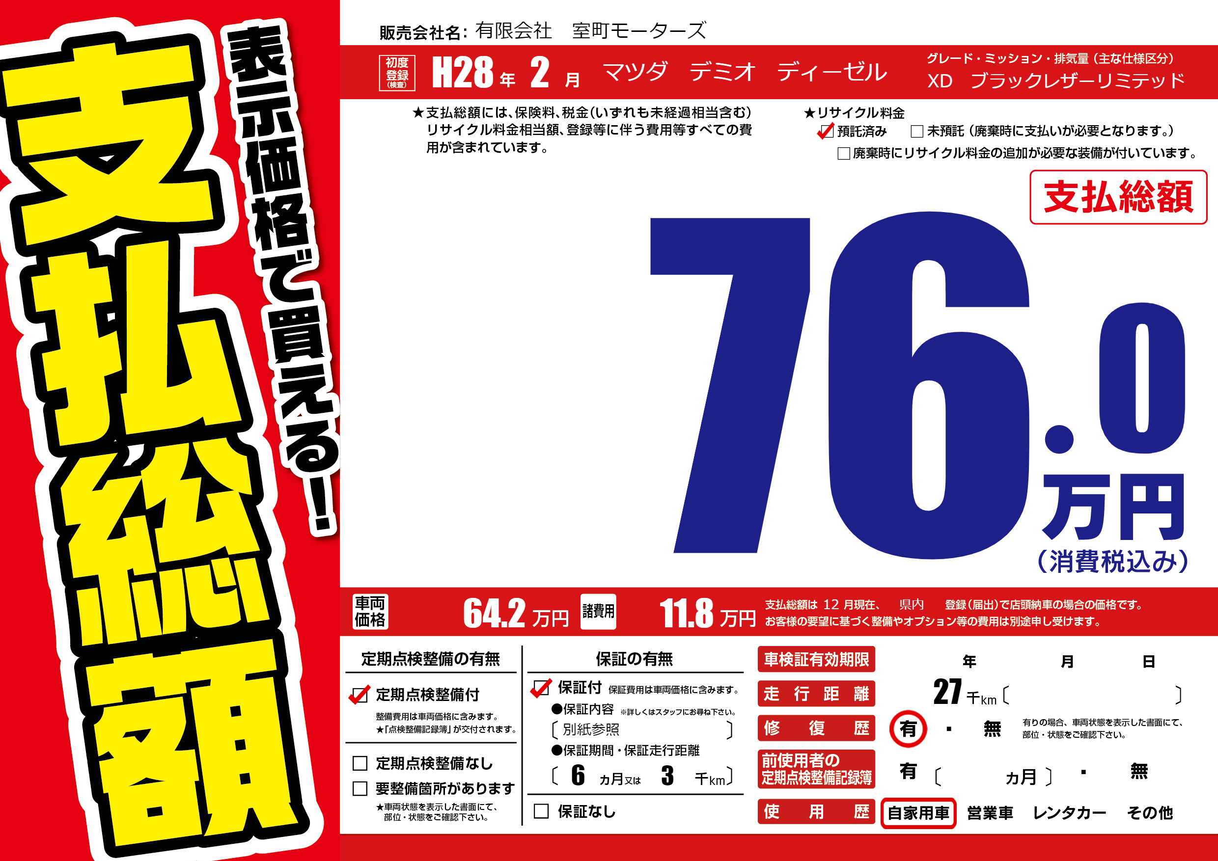 | 車名 | マツダ デミオ ディーゼル | グレード ミッション 排気量 |
