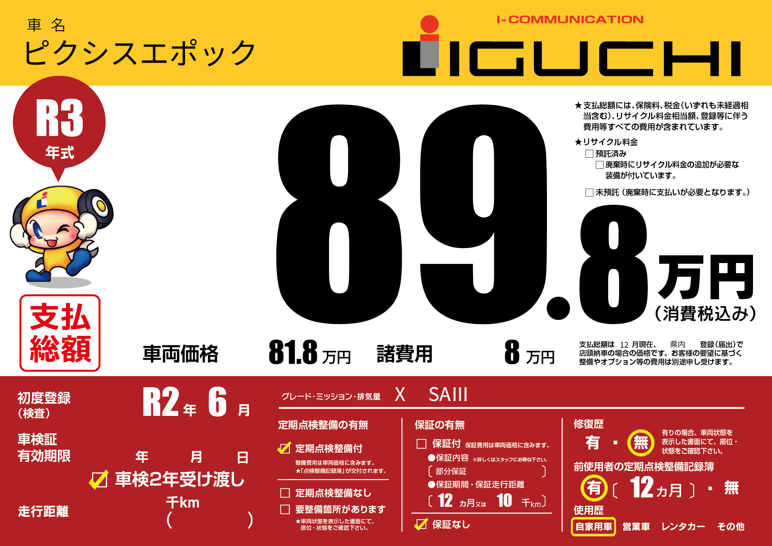 | 車名 | ピクシスエポック | グレード ミッション 排気量 |