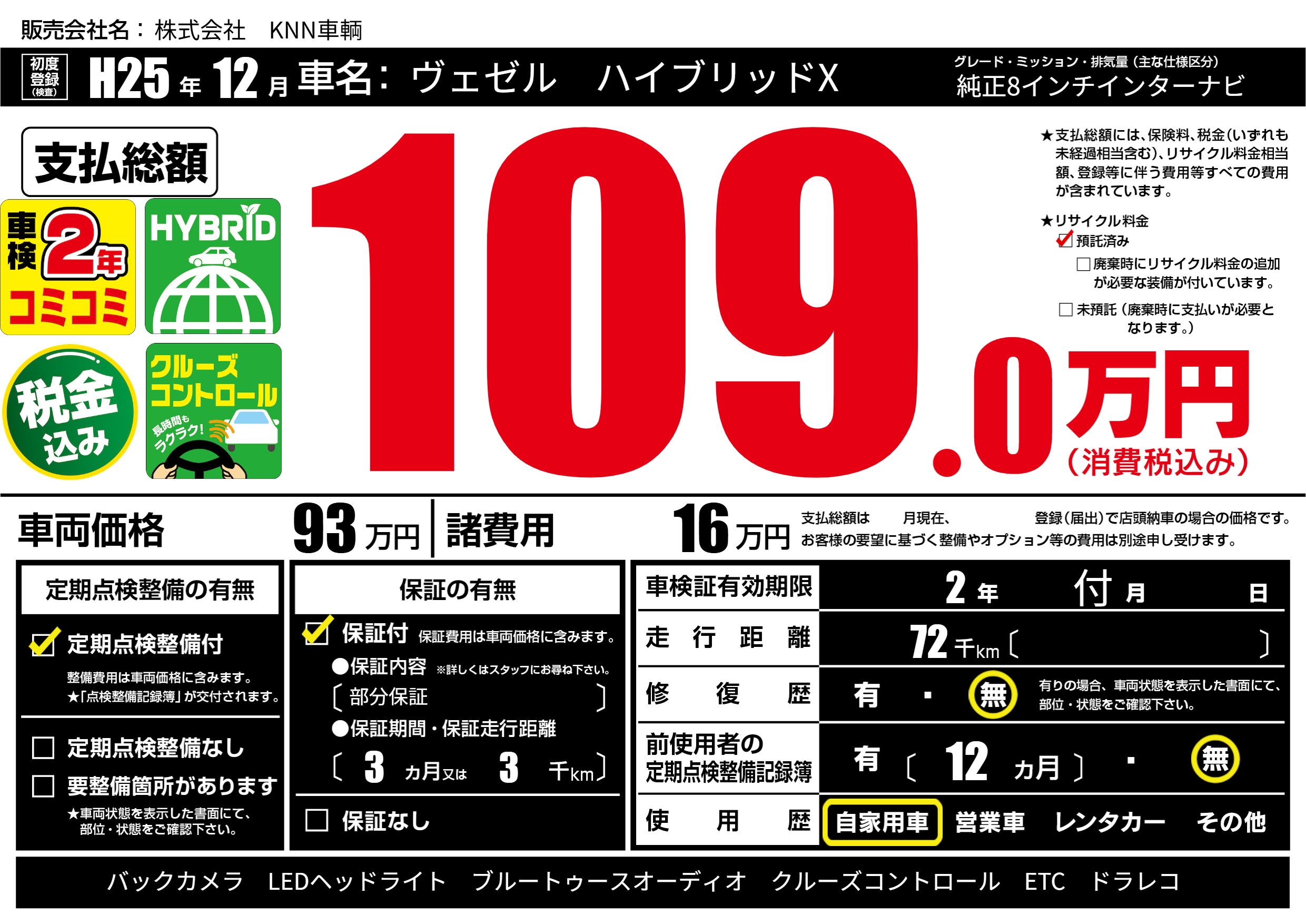 | 車名 | ヴェゼル ハイブリッドX | グレード ミッション 排気量 |