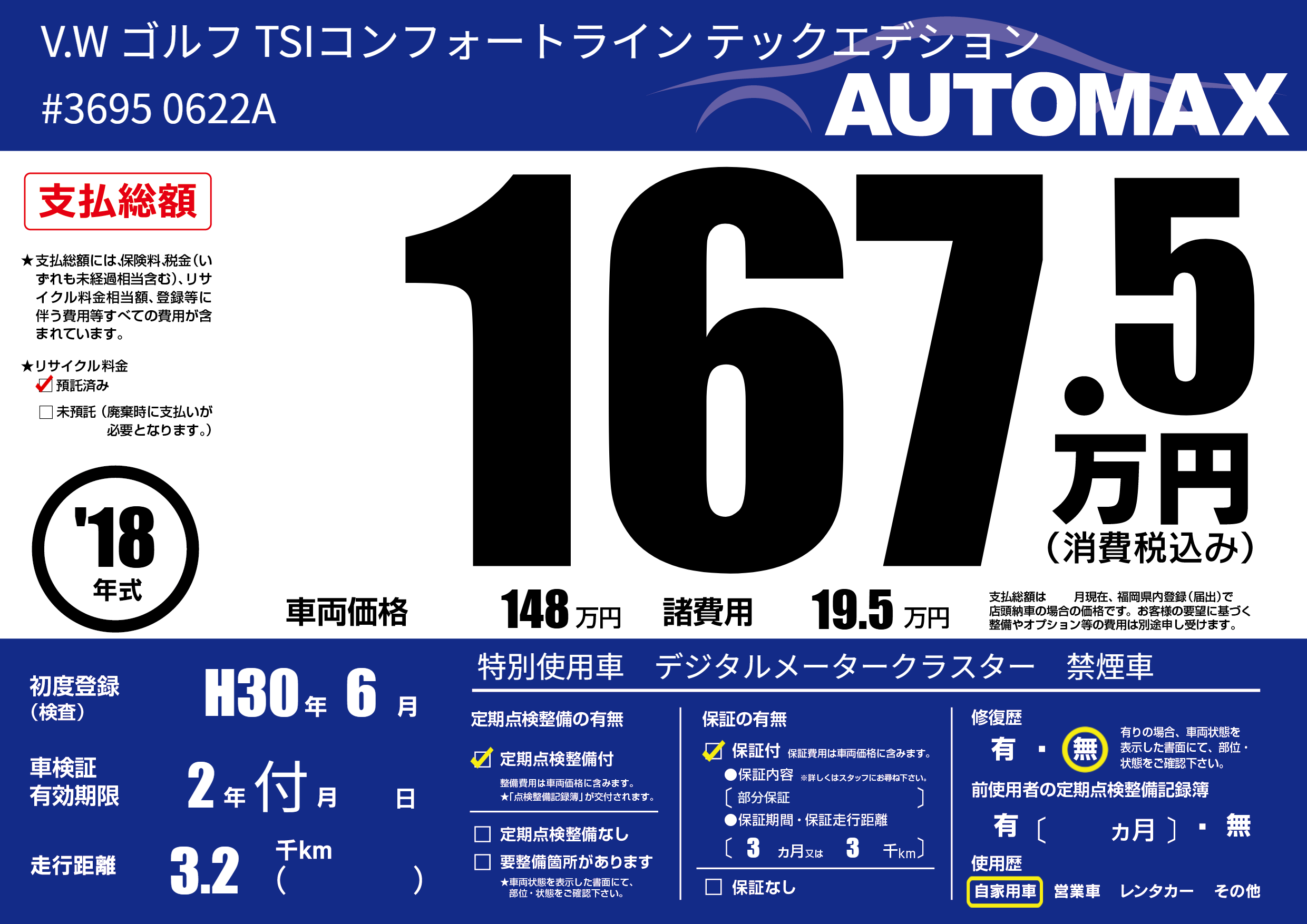 | 車名 | V.W ゴルフ TSIコンフォートライン テックエデション | グレード ミッション 排気量 |