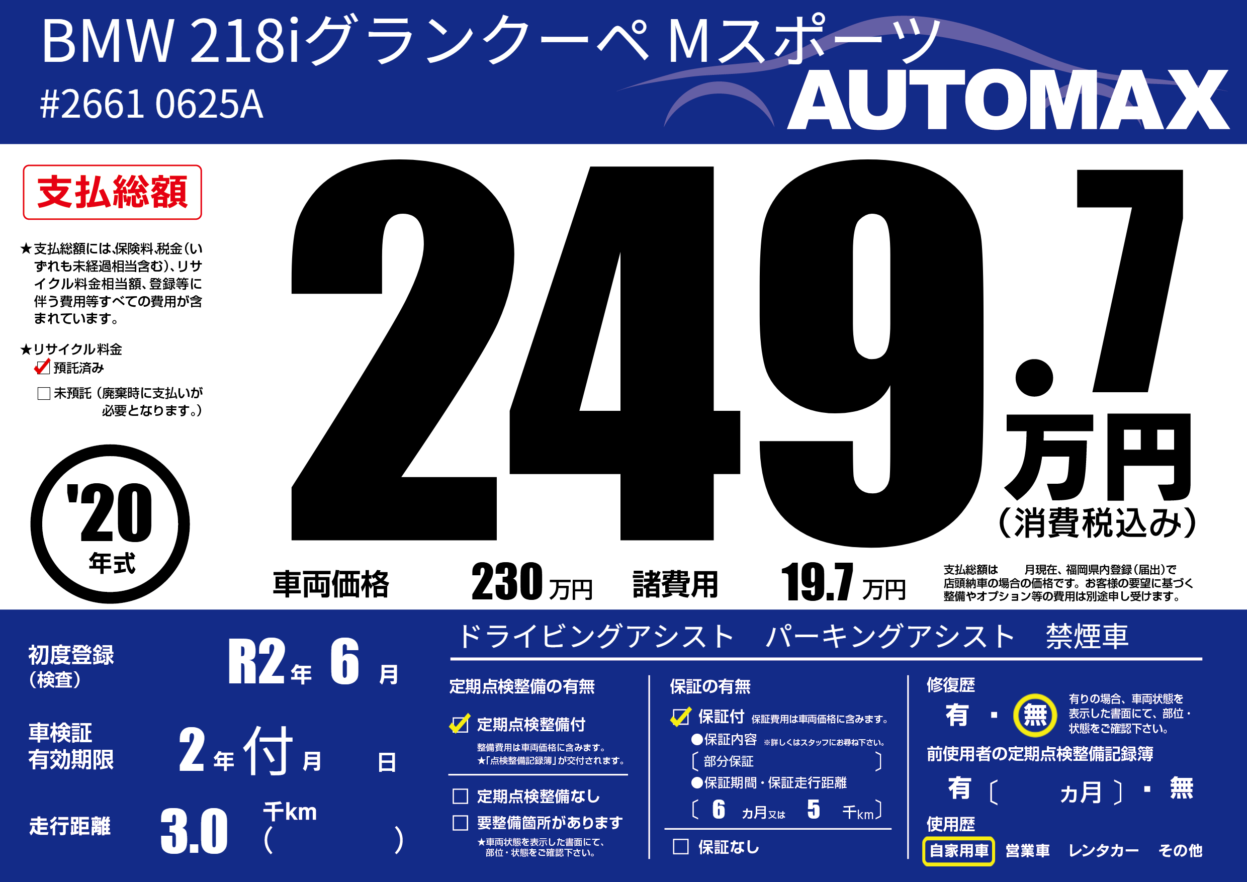 | 走行キロ | 0.3万km | 初年度登録 | R2年6月 |