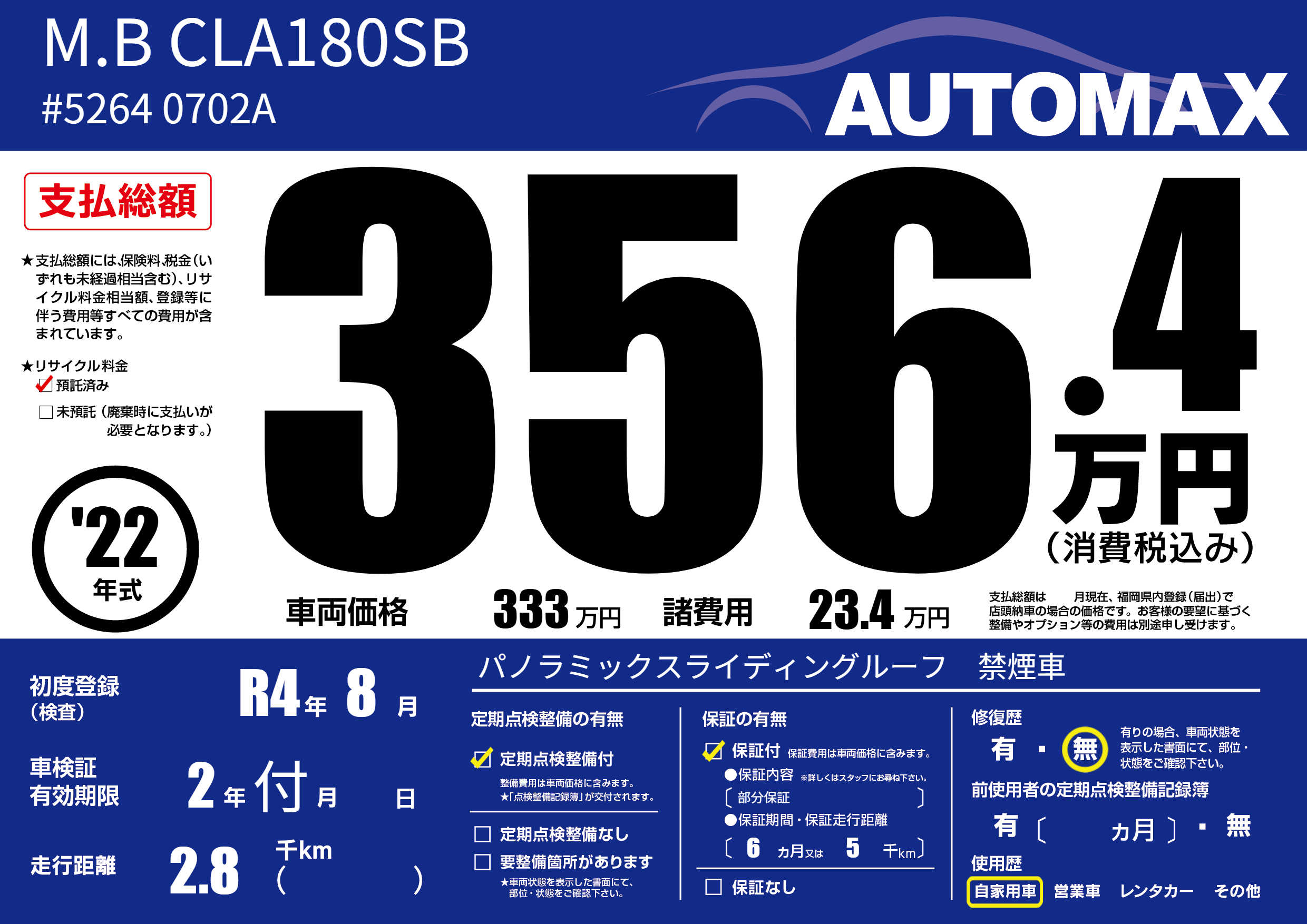 | 車名 | M.B CLA180SB | グレード ミッション 排気量 |