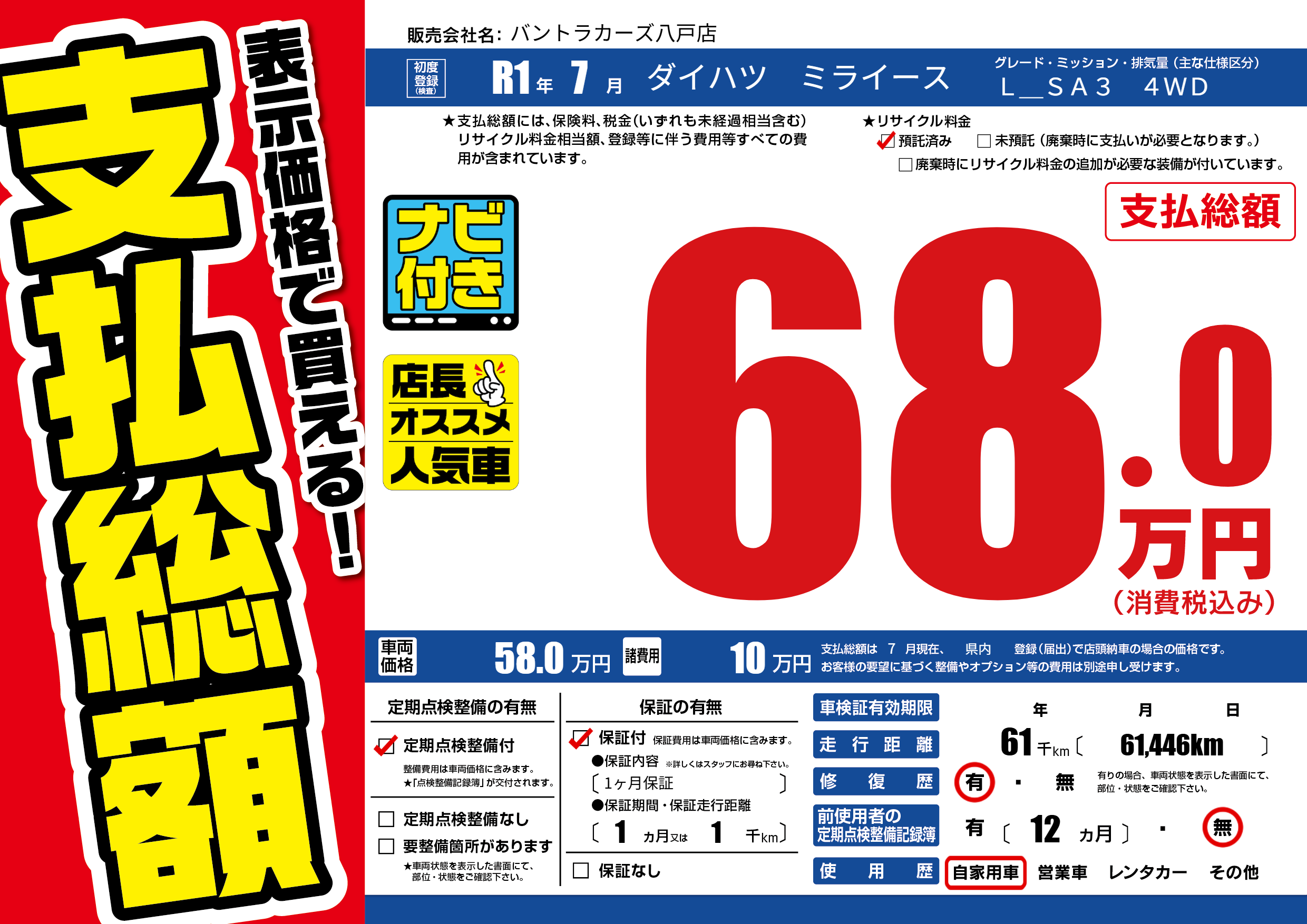 | 走行キロ | 6.1万km | 初年度登録 | R1年7月 |