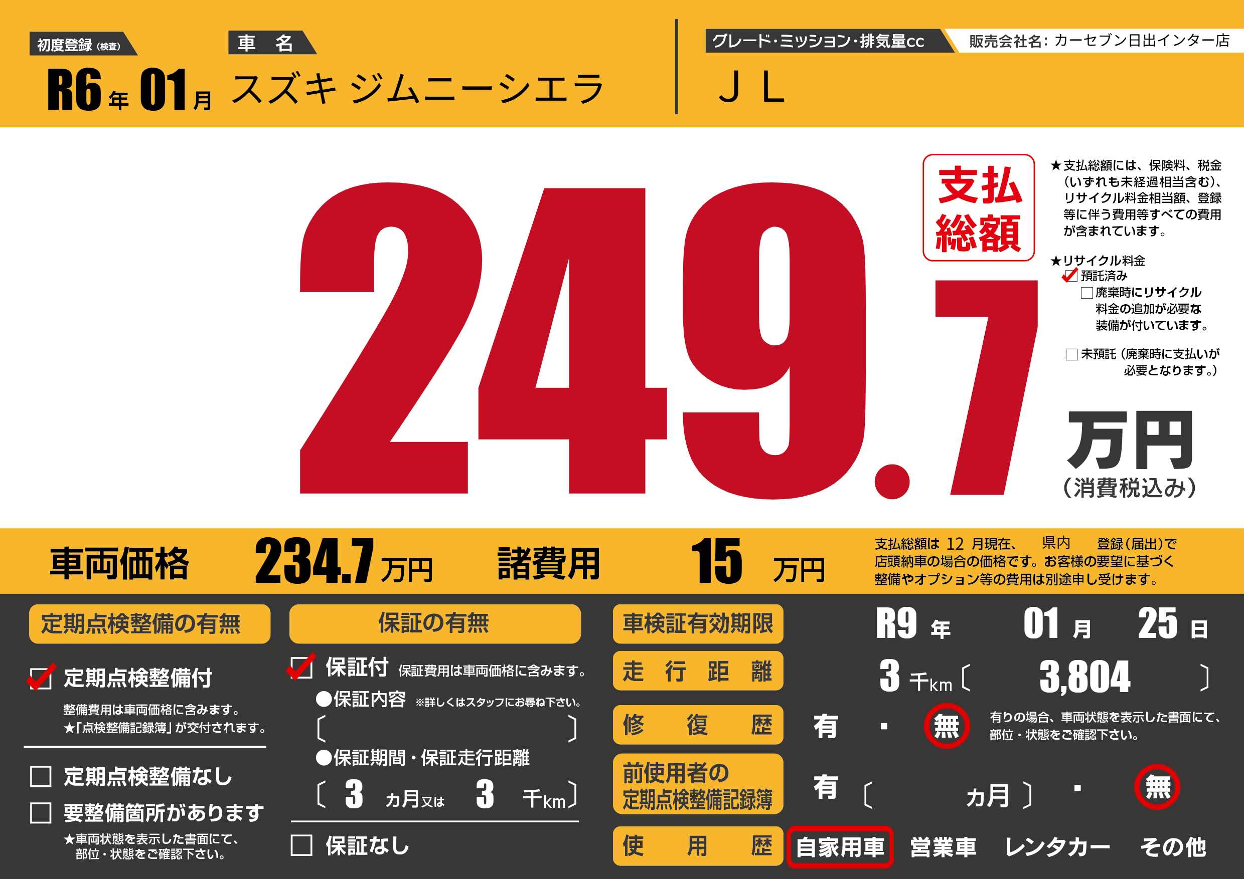 | 走行キロ | 0.3万km | 初年度登録 | R6年01月 |