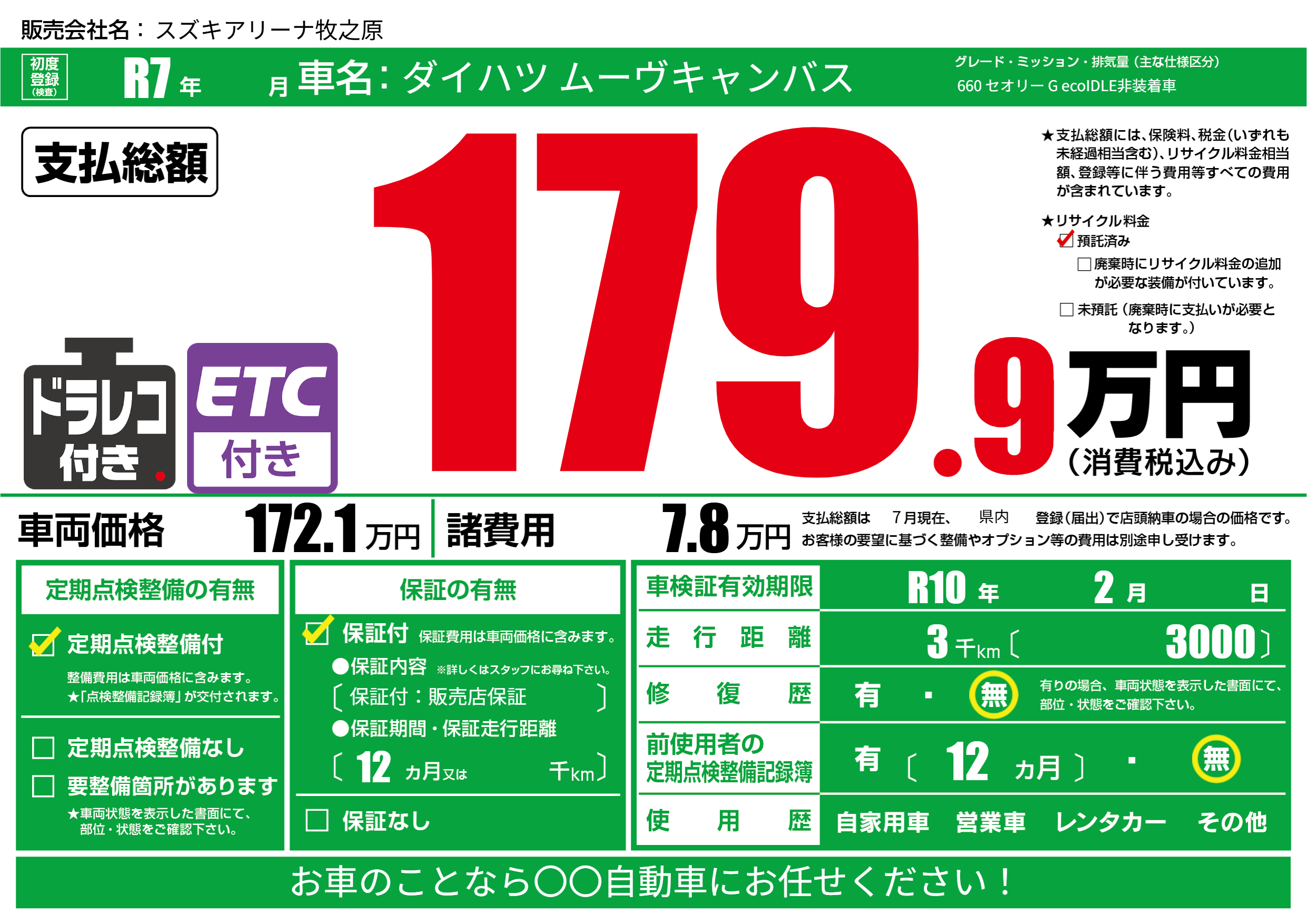 保証なし 保証内容(保証付:販売店保証) 12ヶ月または()千kmまで |