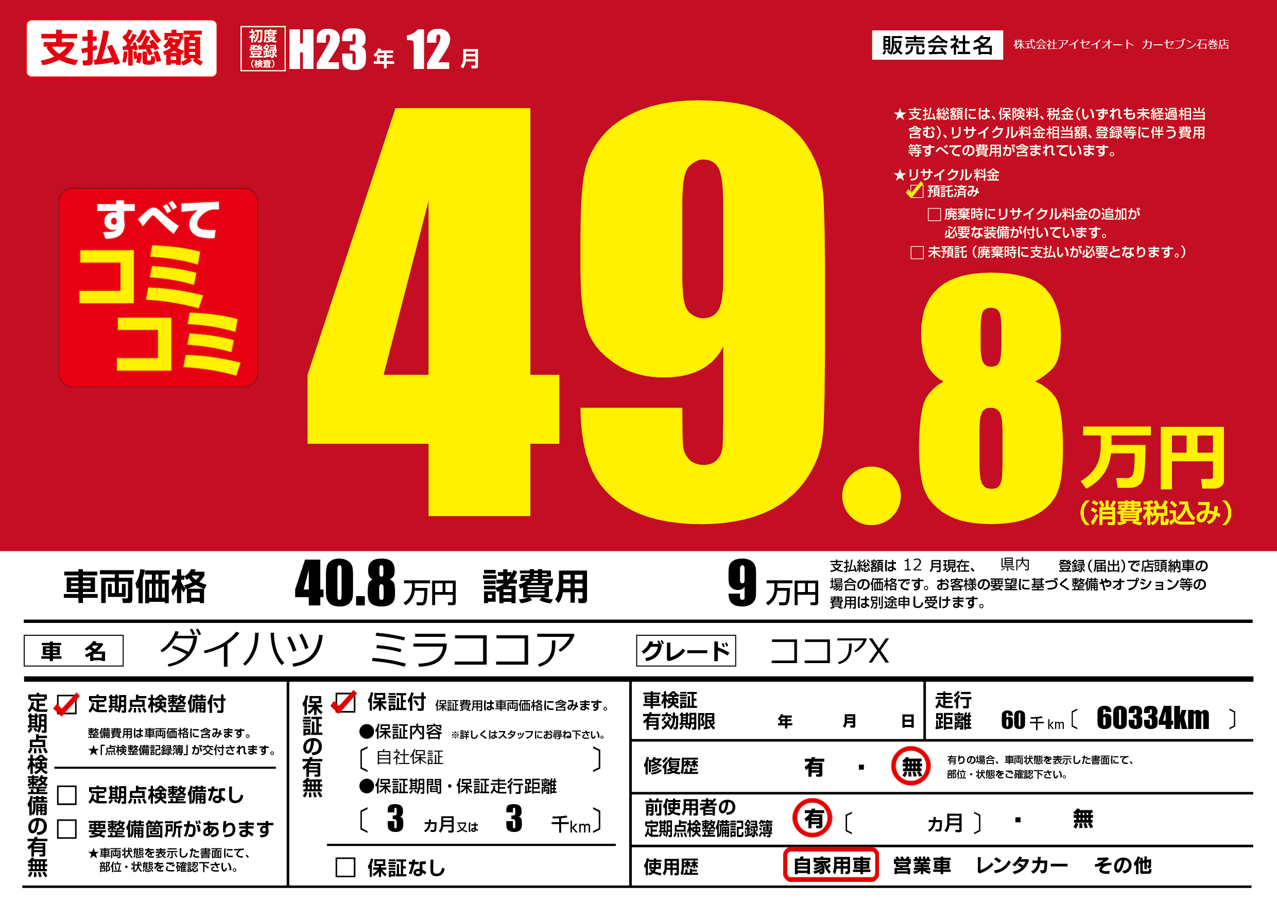 | 車名 | ダイハツ ミラココア | グレード ミッション 排気量 |